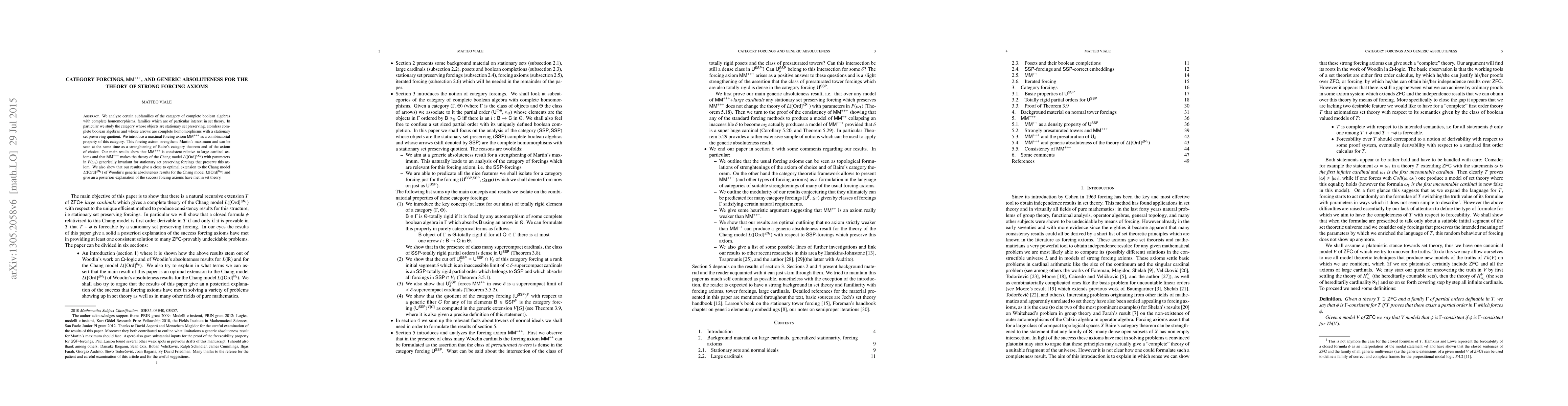 We introduce a category whose objects are stationary set preserving complete boolean algebras and whose arrows are complete homomorphisms with a stationary set preserving quotient. We show that the cut of this category at a rank initial segment of the universe of height a super compact which is a limit of super compact cardinals is a stationary set preserving partial order which forces $MM^{++}$ and collapses its size to become the second uncountable cardinal. Next we argue that any of the known methods to produce a model of $MM^{++}$ collapsing a superhuge cardinal to become the second uncountable cardinal produces a model in which the cutoff of the category of stationary set preserving forcings at any rank initial segment of the universe of large enough height is forcing equivalent to a presaturated tower of normal filters. We let $MM^{+++}$ denote this statement and we prove that the theory of $L(Ord^{\omega_1})$ with parameters in $P(\omega_1)$ is generically invariant for stationary set preserving forcings that preserve $MM^{+++}$. Finally we argue that the work of Larson and Asper\'o shows that this is a next to optimal generalization to the Chang model $L(Ord^{\omega_1})$ of Woodin's generic absoluteness results for the Chang model $L(Ord^{\omega})$. It remains open whether $MM^{+++}$ and $MM^{++}$ are equivalent axioms modulo large cardinals and whether $MM^{++}$ suffices to prove the same generic absoluteness results for the Chang model $L(Ord^{\omega_1})$.
