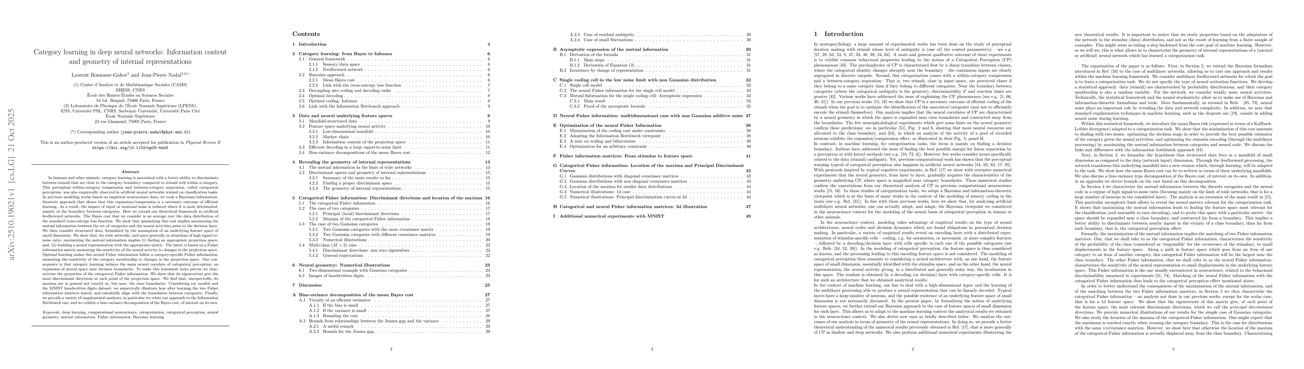 In animals, category learning enhances discrimination between stimuli close to the category boundary. This phenomenon, called categorical perception, was also empirically observed in artificial neural networks trained on classification tasks. In previous modeling works based on neuroscience data, we show that this expansion/compression is a necessary outcome of efficient learning. Here we extend our theoretical framework to artificial networks. We show that minimizing the Bayes cost (mean of the cross-entropy loss) implies maximizing the mutual information between the set of categories and the neural activities prior to the decision layer. Considering structured data with an underlying feature space of small dimension, we show that maximizing the mutual information implies (i) finding an appropriate projection space, and, (ii) building a neural representation with the appropriate metric. The latter is based on a Fisher information matrix measuring the sensitivity of the neural activity to changes in the projection space. Optimal learning makes this neural Fisher information follow a category-specific Fisher information, measuring the sensitivity of the category membership. Category learning thus induces an expansion of neural space near decision boundaries. We characterize the properties of the categorical Fisher information, showing that its eigenvectors give the most discriminant directions at each point of the projection space. We find that, unexpectedly, its maxima are in general not exactly at, but near, the class boundaries. Considering toy models and the MNIST dataset, we numerically illustrate how after learning the two Fisher information matrices match, and essentially align with the category boundaries. Finally, we relate our approach to the Information Bottleneck one, and we exhibit a bias-variance decomposition of the Bayes cost, of interest on its own.