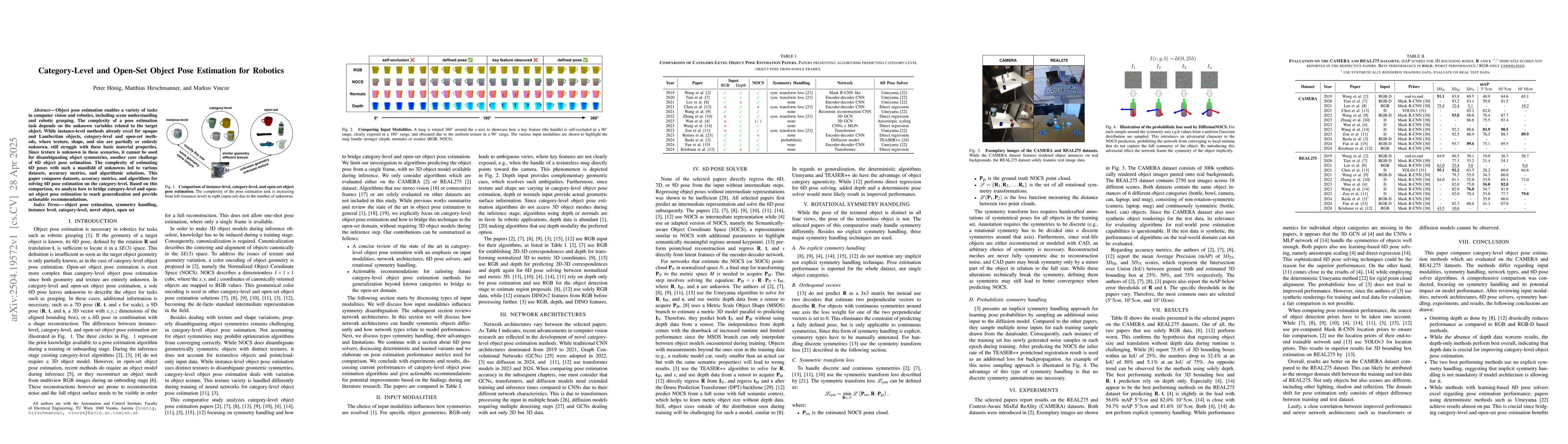 The paper compares datasets, accuracy metrics, and algorithms for category-level 6D object pose estimation, analyzing how to bridge category-level and open-set object pose estimation for generalization.