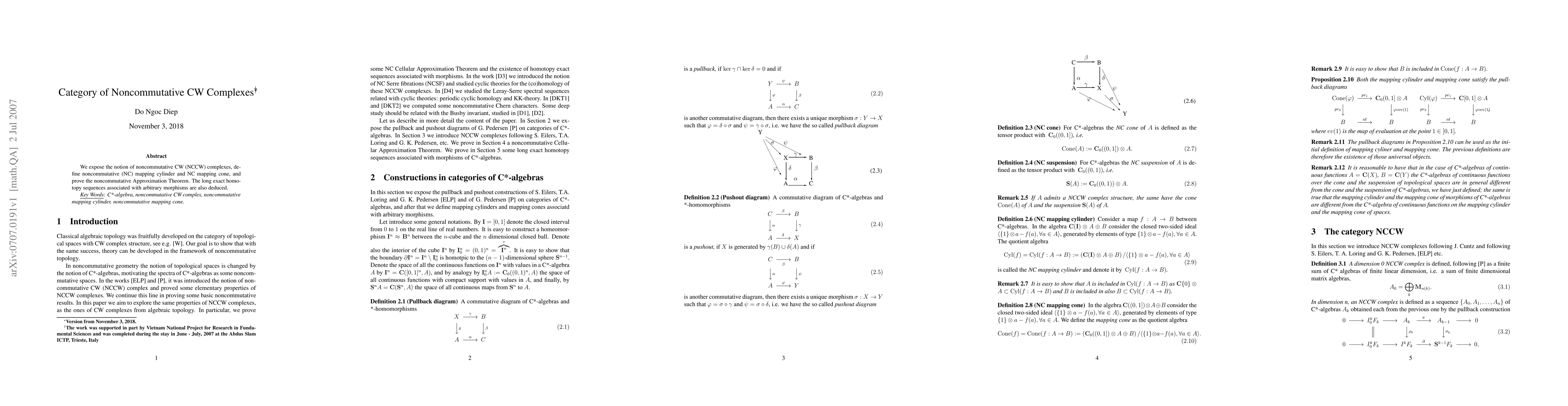 This paper introduces the concept of noncommutative CW (NCCW) complexes, defines noncommutative mapping cylinder and cone, and proves the noncommutative Approximation Theorem, along with deriving the long exact homotopy sequences for arbitrary morphisms.