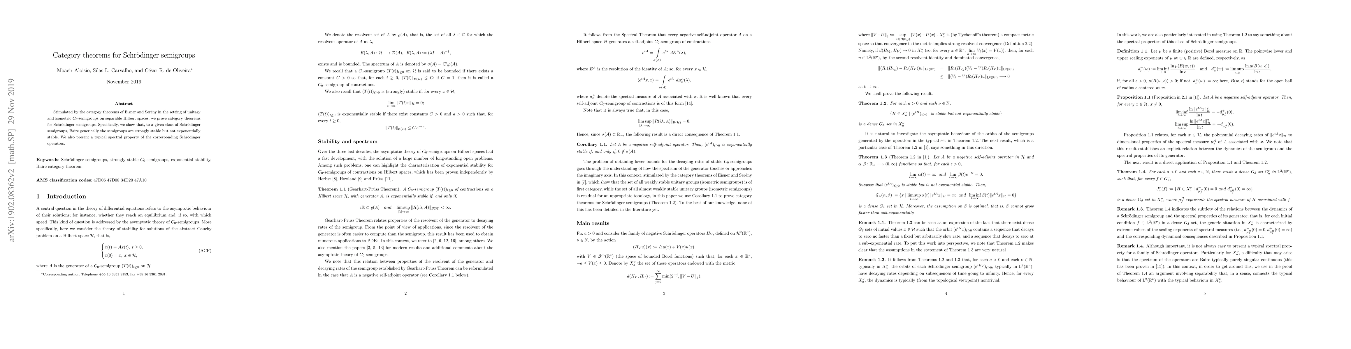 This paper proves category theorems for Schrödinger semigroups, demonstrating that within a given class, the semigroups are generically strongly stable but not exponentially stable. It also identifies a typical spectral property of the associated Schrödinger operators.
