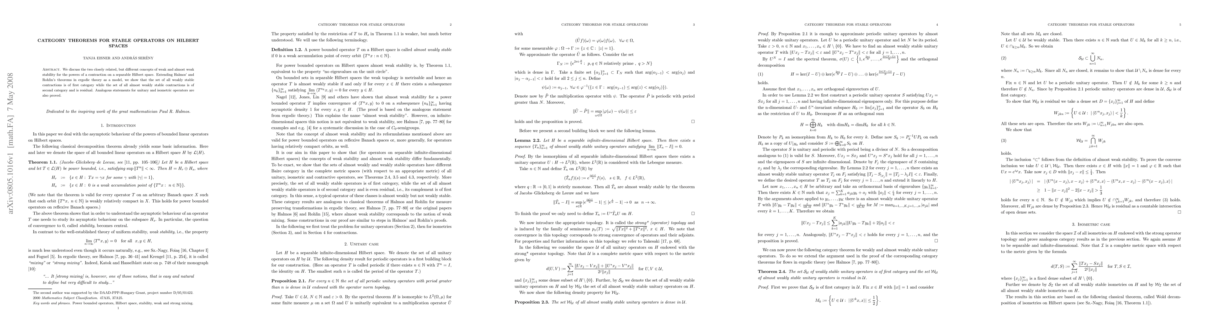 We discuss the two closely related, but different concepts of weak and almost weak stability for the powers of a contraction on a separable Hilbert space. Extending Halmos' and Rohlin's theorems in ergodic theory as a model, we show that the set of all weakly stable contractions is of first category while the set of all almost weakly stable contractions is of second category and is residual. Analogous statements for unitary and isometric operators are also proved.