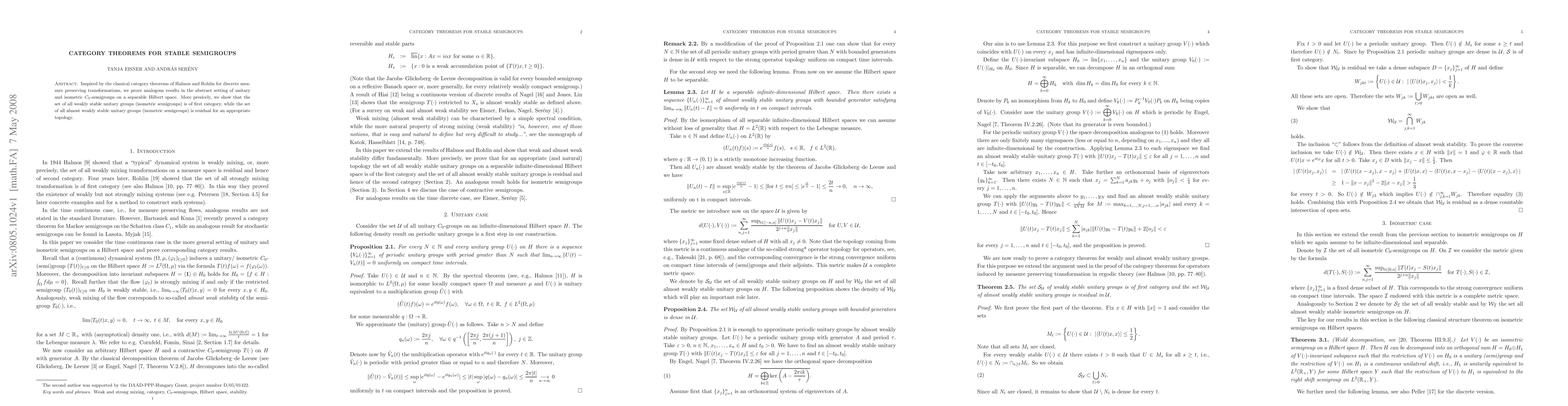 This paper proves category theorems for stable semigroups, showing that the set of weakly stable unitary groups is of first category, while the set of almost weakly stable unitary groups is residual in the appropriate topology, extending classical results from measure theory to C_0-semigroups on Hilbert spaces.