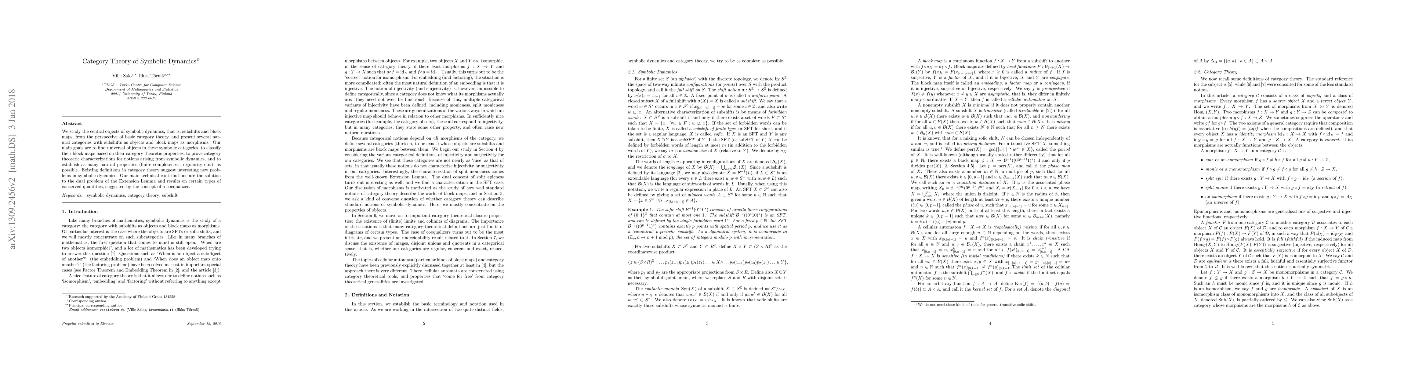 This paper explores symbolic dynamics through the lens of category theory, focusing on subshifts and block maps, and aims to identify universal objects and classify block maps based on their categorical properties. Key contributions include solving the dual problem of the Extension Lemma and investigating conserved quantities via coequalizers.