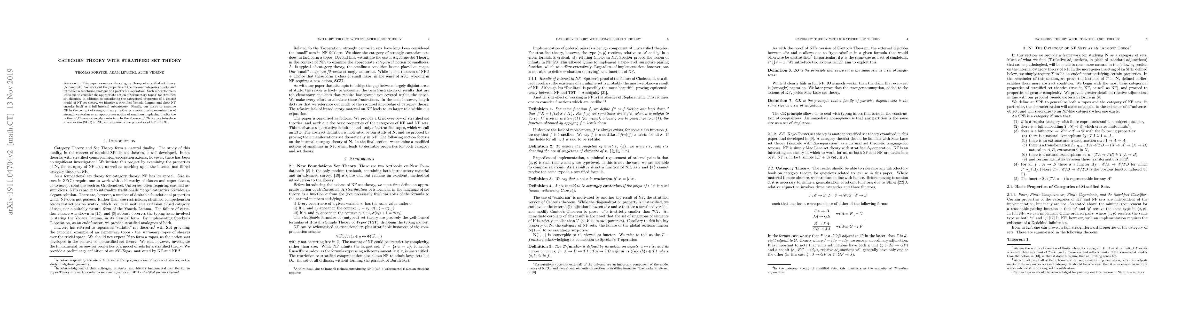 This paper examines the category theory of stratified set theory (NF and KF). We work out the properties of the relevant categories of sets, and introduce a functorial analogue to Specker's T-operation. Such a development leads one to consider the appropriate notion of "elementary topos" for stratified set theories. In addition to considering the categorical properties of a generic model of NF set theory, we identify a stratified Yoneda Lemma and show NF encodes itself as a full internal subcategory. Finally, our desire to examine NF in the context of category theory motivates a more precise examination of strongly cantorian as an appropriate notion of smallness, replacing it with the notion of fibrewise strongly cantorian. In the absence of Choice, we introduce a new axiom (SCU) to NF, and examine some properties of NF + SCU.
