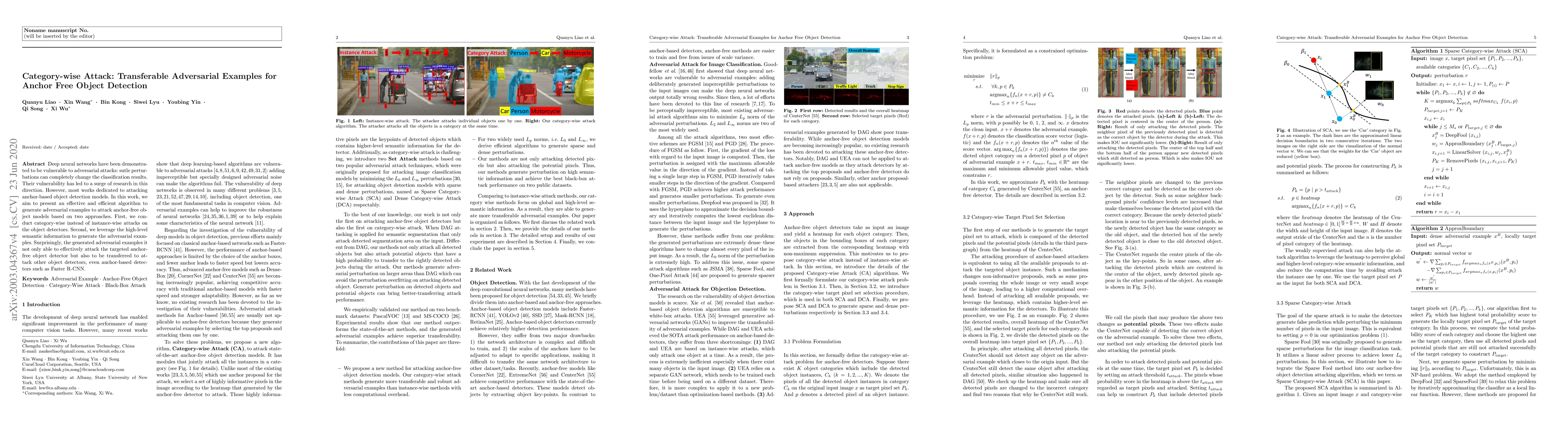 This paper proposes an efficient algorithm to generate transferable adversarial examples targeting anchor-free object detection models through category-wise attacks and leveraging high-level semantic information. The generated adversarial examples can also effectively attack other detectors, including anchor-based models like Faster R-CNN.