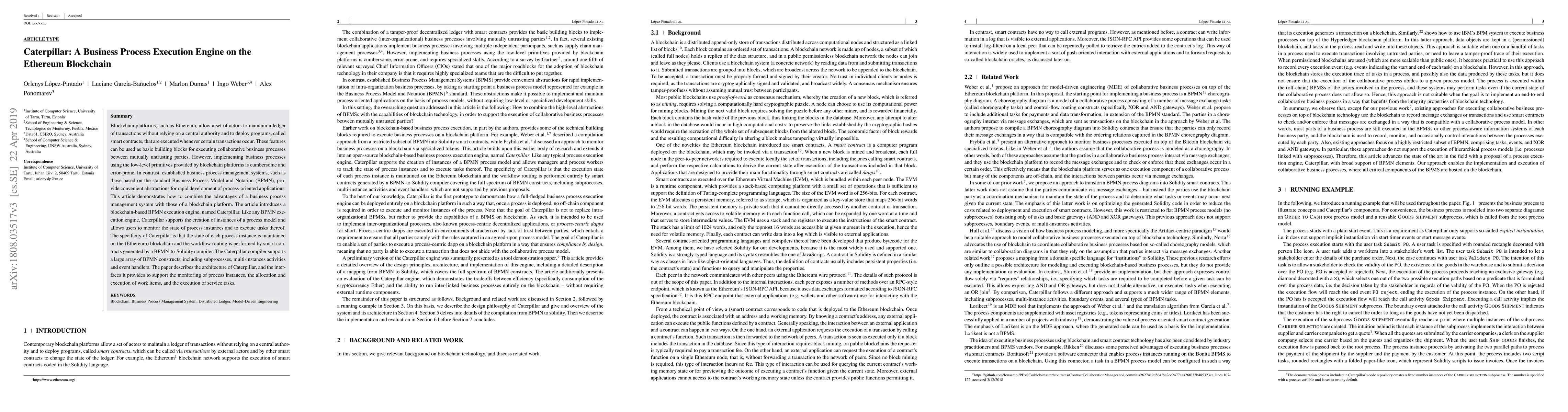 Caterpillar is a blockchain-based BPMN execution engine that combines the advantages of business process management systems with Ethereum's blockchain. It maintains process state on the blockchain and uses smart contracts for workflow routing, supporting a wide range of BPMN constructs.