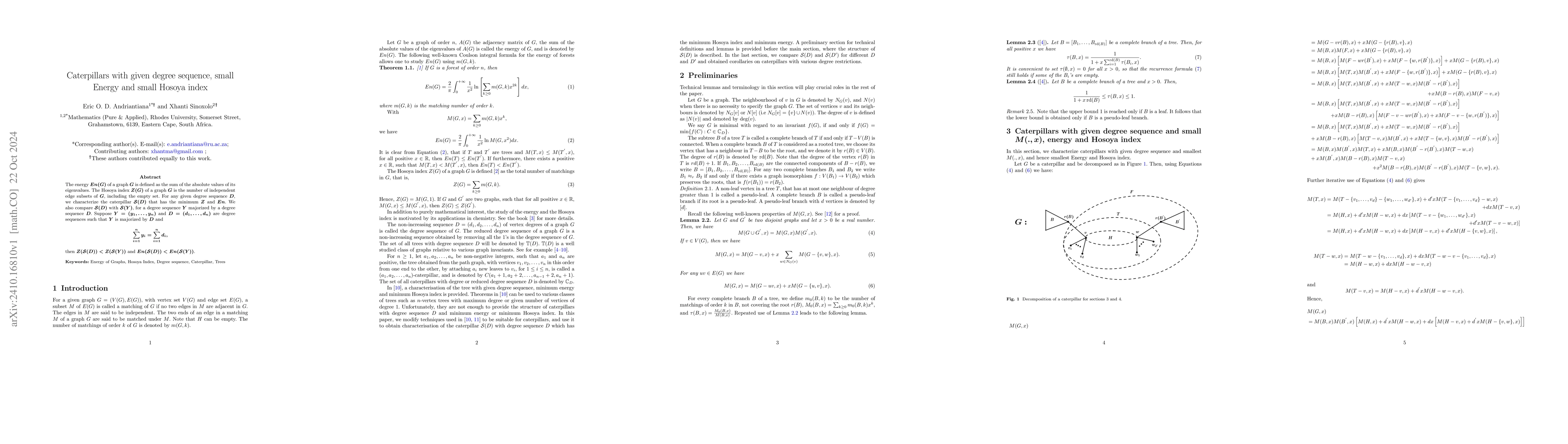 This paper characterizes caterpillar graphs $\mathcal{S}(D)$ with a given degree sequence $D$ that minimize the Hosoya index $Z$ and energy $En$. It shows that $\mathcal{S}(D)$ has alternating large and small degrees along its internal path and demonstrates that it outperforms $\mathcal{S}(Y)$ in $Z$ and $En$ when $Y$ is majorized by $D$.