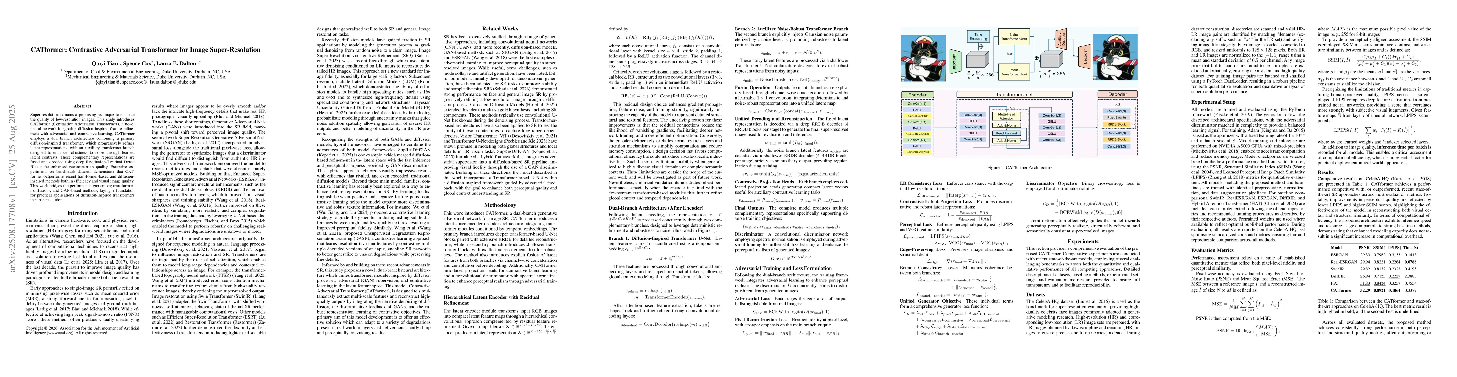 Super-resolution remains a promising technique to enhance the quality of low-resolution images. This study introduces CATformer (Contrastive Adversarial Transformer), a novel neural network integrating diffusion-inspired feature refinement with adversarial and contrastive learning. CATformer employs a dual-branch architecture combining a primary diffusion-inspired transformer, which progressively refines latent representations, with an auxiliary transformer branch designed to enhance robustness to noise through learned latent contrasts. These complementary representations are fused and decoded using deep Residual-in-Residual Dense Blocks for enhanced reconstruction quality. Extensive experiments on benchmark datasets demonstrate that CATformer outperforms recent transformer-based and diffusion-inspired methods both in efficiency and visual image quality. This work bridges the performance gap among transformer-, diffusion-, and GAN-based methods, laying a foundation for practical applications of diffusion-inspired transformers in super-resolution.