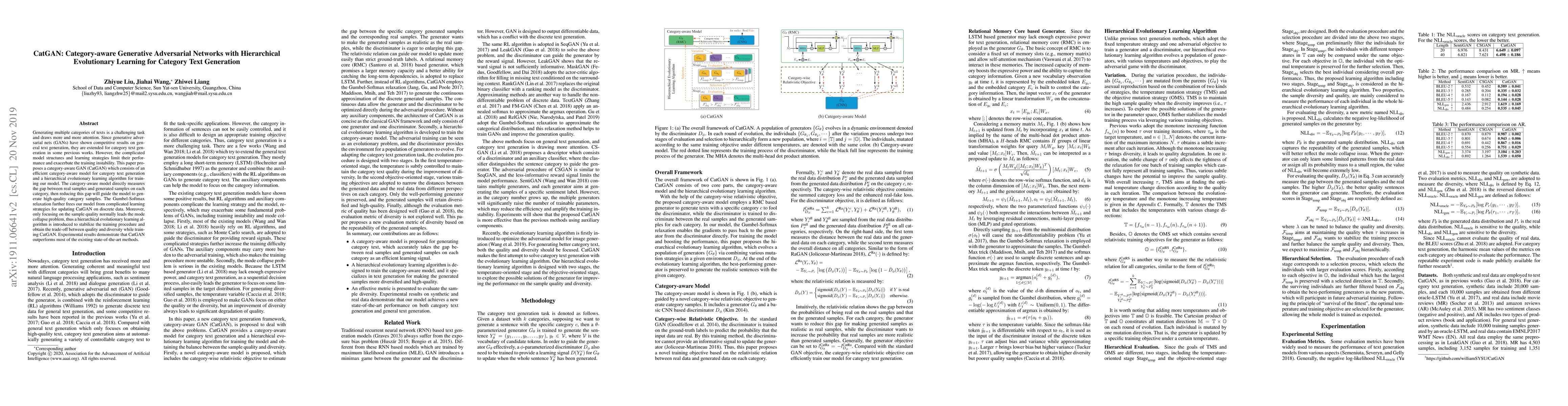This paper introduces CatGAN, a category-aware GAN with hierarchical evolutionary learning for generating high-quality text across multiple categories, addressing training instability and mode collapse issues. The model employs Gumbel-Softmax relaxation and hierarchical learning to achieve superior performance compared to existing methods.