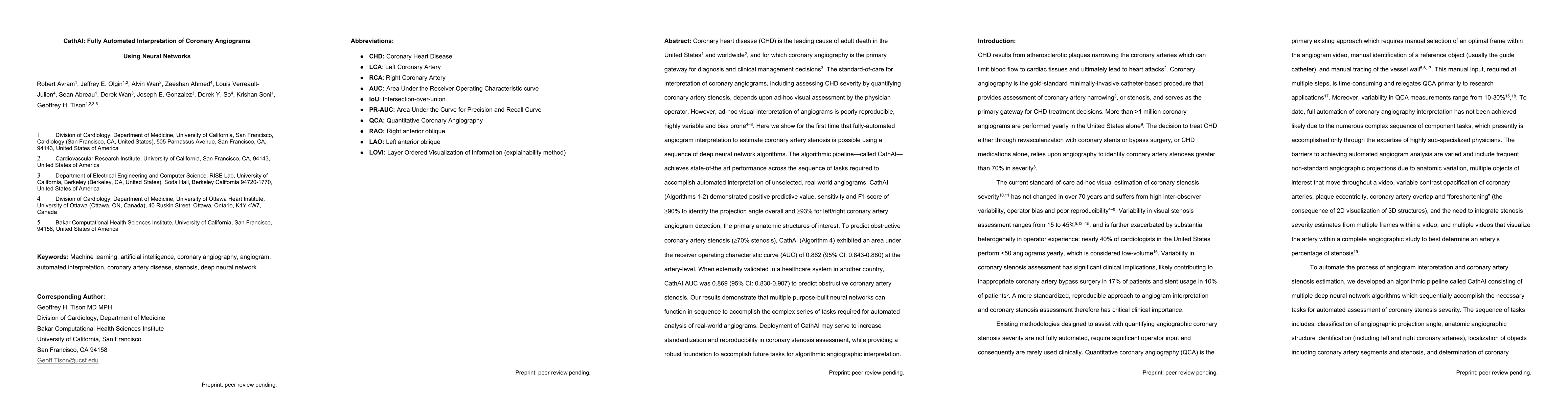CathAI employs a series of deep neural networks to fully automate the interpretation of coronary angiograms, achieving high accuracy in detecting coronary artery stenosis and anatomical structures. The system demonstrates robust performance and potential for increasing standardization in clinical diagnosis.