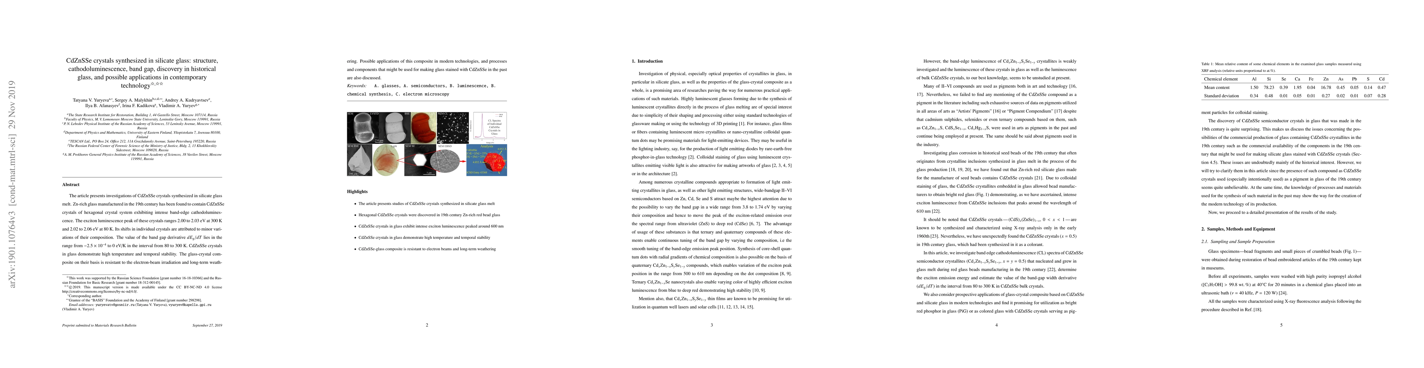The article presents an experimental investigation of band-edge cathodoluminescence of CdZnSSe crystals that nucleated and grew in silicate glass melt during its production. We have studied Zn-rich red glass made for manufacture of seed beads in the 19th century and found it to contain CdZnSSe crystals. Due to colloidal staining using the CdZnSSe crystallites embedded in glass, glass makers were enabled to produce lustrous red glass that, as we presently know, manifests bright luminescence. The CdZnSSe crystallites exhibit intense band-edge cathodoluminescence both at room temperature and at liquid nitrogen temperature. We have found the band-edge cathodoluminescence of these crystals to peak in the range from 2.00 to 2.03 eV at 300 K and from 2.02 to 2.06 eV at 80 K. We have also estimated the value of the band gap derivative d$E_g$/d$T$ in the interval from 80 to 300 K and found it to lie in the range from $-2.5 \times 10^{-4}$ to 0 eV/K. CdZnSSe crystals in glass demonstrate high temperature and temporal stability. The glass-crystal composite on their basis is resistant to the electron-beam irradiation and long-term weathering. Possible applications of this composite in modern technologies, and processes and components that might be used for making glass stained with CdZnSSe in the past are also discussed.
