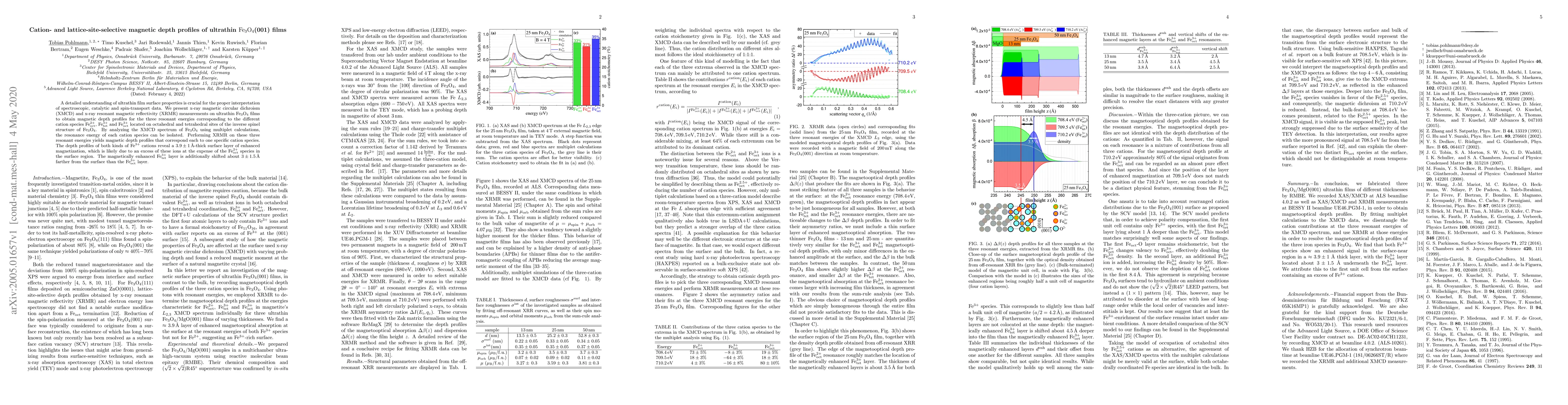 A detailed understanding of ultrathin film surface properties is crucial for the proper interpretation of spectroscopic, catalytic and spin-transport data. We present x-ray magnetic circular dichroism (XMCD) and x-ray resonant magnetic reflectivity (XRMR) measurements on ultrathin $\mathrm{Fe_3O_4}$ films to obtain magnetic depth profiles for the three resonant energies corresponding to the different cation species $\mathrm{Fe^{2+}_{oct}}$, $\mathrm{Fe^{3+}_{tet}}$ and $\mathrm{Fe^{3+}_{oct}}$ located on octahedral and tetrahedral sites of the inverse spinel structure of $\mathrm{Fe_3O_4}$. By analyzing the XMCD spectrum of $\mathrm{Fe_3O_4}$ using multiplet calculations, the resonance energy of each cation species can be isolated. Performing XRMR on these three resonant energies yields magnetic depth profiles that correspond each to one specific cation species. The depth profiles of both kinds of $\mathrm{Fe^{3+}}$ cations reveal a $\mathrm{3.9 \pm 1~\r{A}}$-thick surface layer of enhanced magnetization, which is likely due to an excess of these ions at the expense of the $\mathrm{Fe^{2+}_{oct}}$ species in the surface region. The magnetically enhanced $\mathrm{Fe^{3+}_{tet}}$ layer is additionally shifted about $\mathrm{3\pm 1.5~\r{A}}$ farther from the surface than the $\mathrm{Fe^{3+}_{oct}}$ layer.