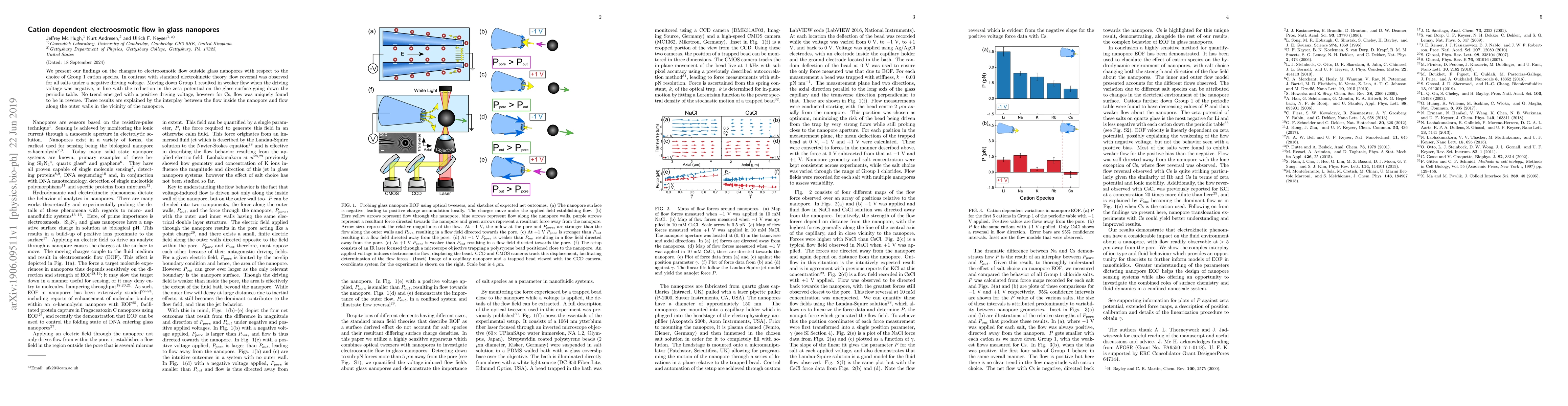This study investigates cation-dependent electroosmotic flow in glass nanopores, revealing flow reversal for all Group 1 cations under negative voltages, with weaker flow as the cation moves down Group 1. Positive voltages showed no clear trend except for Cs, which uniquely exhibited reverse flow, attributed to the interaction between inner nanopore flow and outer wall flow.