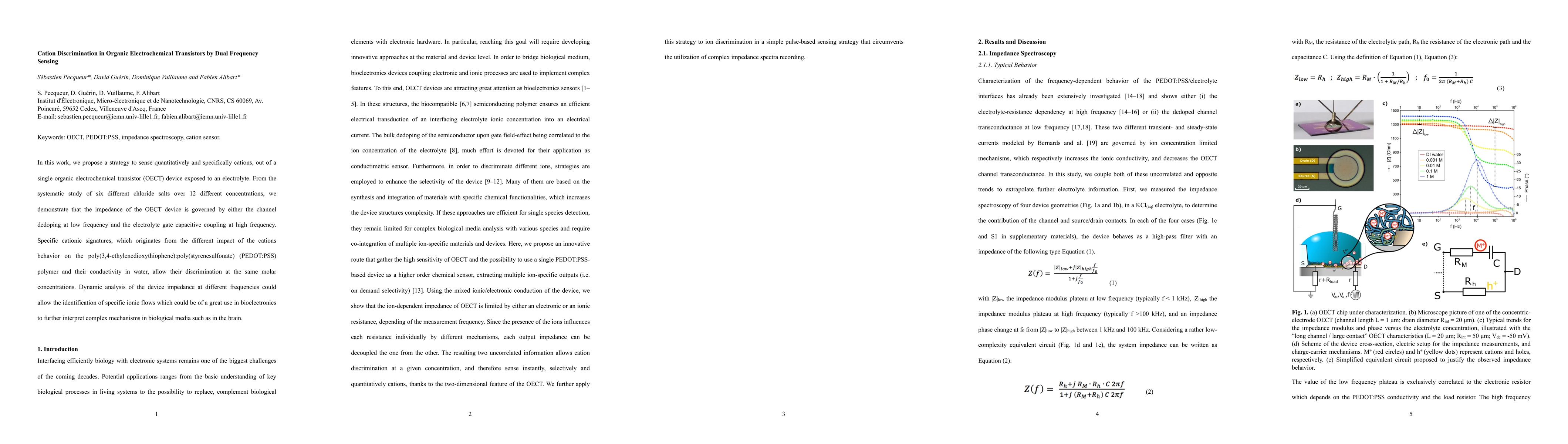 In this work, we propose a strategy to sense quantitatively and specifically cations, out of a single organic electrochemical transistor (OECT) device exposed to an electrolyte. From the systematic study of six different chloride salts over 12 different concentrations, we demonstrate that the impedance of the OECT device is governed by either the channel dedoping at low frequency and the electrolyte gate capacitive coupling at high frequency. Specific cationic signatures, which originates from the different impact of the cations behavior on the poly(3,4-ethylenedioxythiophene):poly(styrenesulfonate) (PEDOT:PSS) polymer and their conductivity in water, allow their discrimination at the same molar concentrations. Dynamic analysis of the device impedance at different frequencies could allow the identification of specific ionic flows which could be of a great use in bioelectronics to further interpret complex mechanisms in biological media such as in the brain.