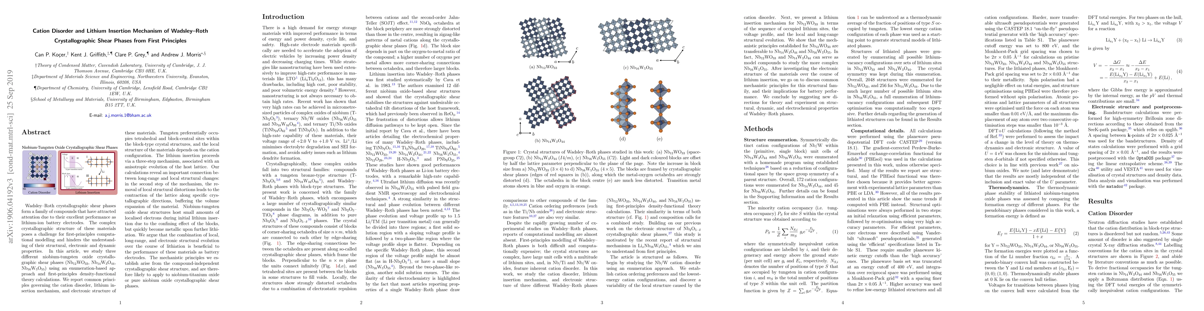 Wadsley--Roth crystallographic shear phases form a family of compounds that have attracted attention due to their excellent performance as lithium-ion battery electrodes. The complex crystallographic structure of these materials poses a challenge for first-principles computational modelling and hinders the understanding of their structural, electronic and dynamic properties. In this article, we study three different niobium-tungsten oxide crystallographic shear phases (Nb$_{12}$WO$_{33}$, Nb$_{14}$W$_{3}$O$_{44}$, Nb$_{16}$W$_5$O$_{55}$) using an enumeration-based approach and first-principles density-functional theory calculations. We report common principles governing the cation disorder, lithium insertion mechanism, and electronic structure of these materials. Tungsten preferentially occupies tetrahedral and block-central sites within the block-type crystal structures. The lithium insertion proceeds via a three-step mechanism, associated with an anisotropic evolution of the host lattice. Our calculations reveal an important connection between long-range and local structural changes: in the second step of the mechanism, the removal of local structural distortions leads to the contraction of the lattice along specific crystallographic directions, buffering the volume expansion of the material. Niobium-tungsten oxide shear structures host small amounts of localised electrons during initial lithium insertion due to the confining effect of the blocks, but quickly become metallic upon further lithiation. We argue that the combination of local, long-range, and electronic structural evolution over the course of lithiation is beneficial to the performance of these materials as battery electrodes. The mechanistic principles we establish arise from the compound-independent crystallographic shear structure, and are therefore likely to apply to Ti/Nb oxide or pure Nb oxide shear phases.
