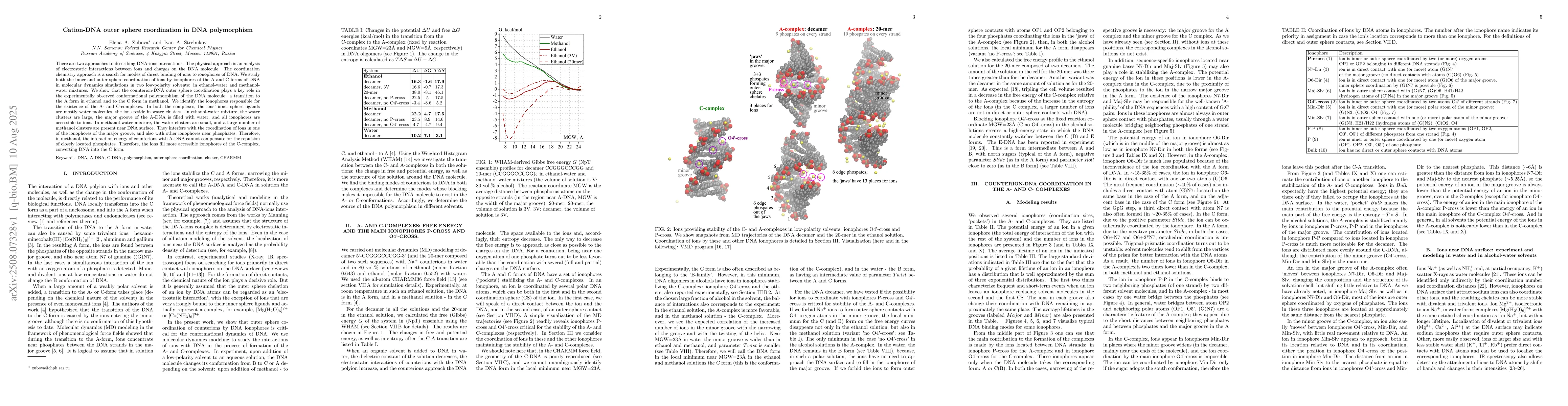There are two approaches to describing DNA-ions interactions. The physical approach is an analysis of electrostatic interactions between ions and charges on the DNA molecule. The coordination chemistry approach is a search for modes of direct binding of ions to ionophores of DNA. We study both the inner and outer sphere coordination of ions by ionophores of the A and C forms of DNA in molecular dynamics simulations in two low-polarity solvents: in ethanol-water and methanol-water mixtures. We show that the counterion-DNA outer sphere coordination plays a key role in the experimentally observed conformational polymorphism of the DNA molecule: a transition to the A form in ethanol and to the C form in methanol. We identify the ionophores responsible for the existence of the A- and C-complexes. In both the complexes, the ions' inner sphere ligands are mostly water molecules, the ions reside in water clusters. In ethanol-water mixture, the water clusters are large, the major groove of the A-DNA is filled with water, and all ionophores are accessible to ions. In methanol-water mixture, the water clusters are small, and a large number of methanol clusters are present near DNA surface. They interfere with the coordination of ions in one of the ionophores of the major groove, and also with other ionophores near phosphates. Therefore, in methanol, the interaction energy of counterions with A-DNA cannot compensate for the repulsion of closely located phosphates. Therefore, the ions fill more accessible ionophores of the C-complex, converting DNA into the C form.