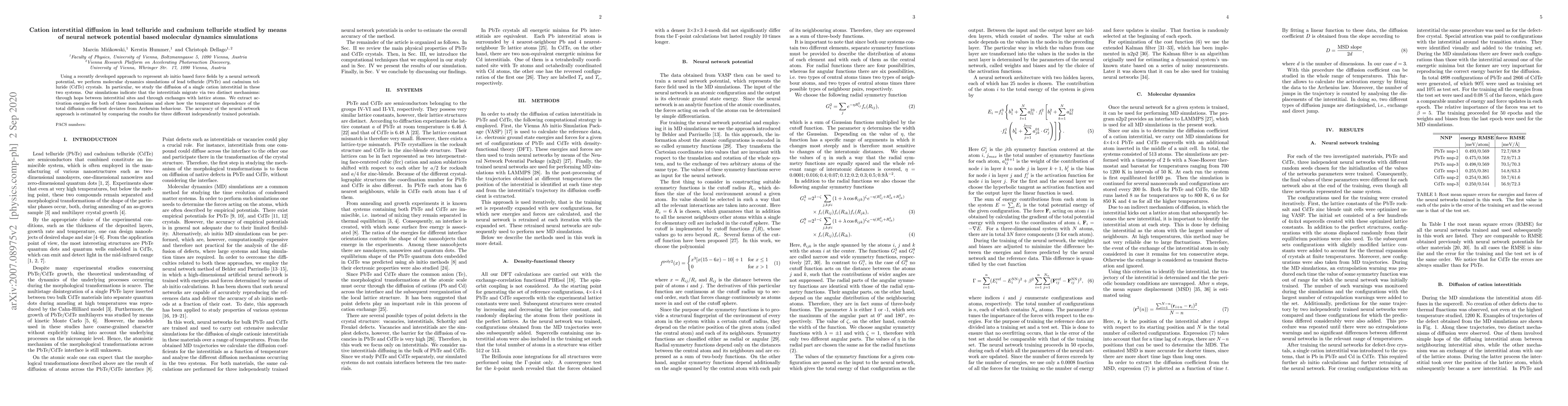 This research uses neural network potentials for molecular dynamics simulations to study cation interstitial diffusion in PbTe and CdTe, revealing two migration mechanisms: interstitial site hops and lattice atom exchanges, with non-Arrhenius temperature dependence. The method's accuracy is validated by comparing results from three trained potentials.