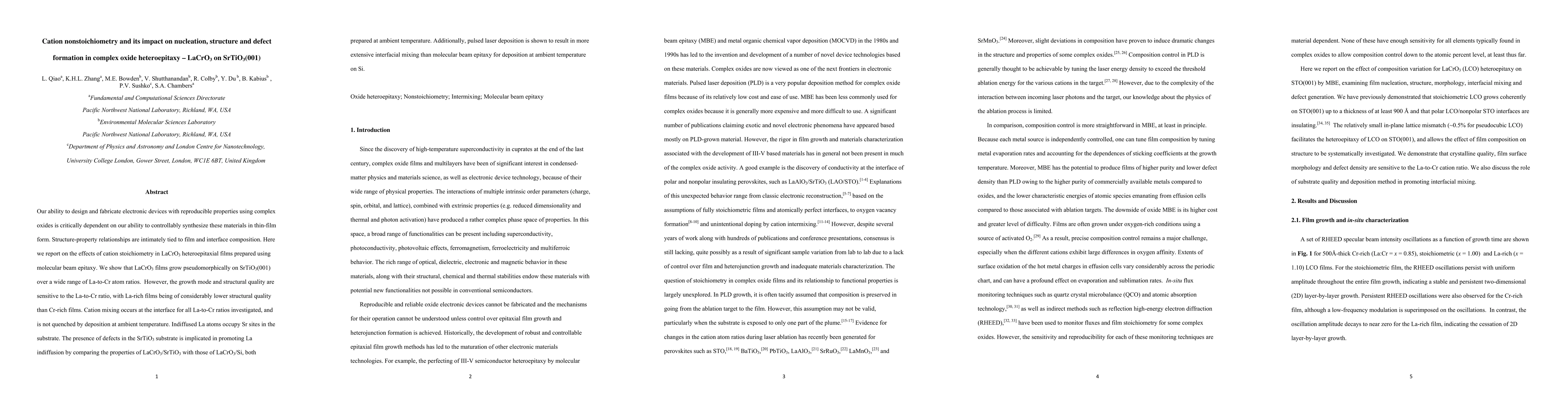 Our ability to design and fabricate electronic devices with reproducible properties using complex oxides is critically dependent on our ability to controllably synthesize these materials in thin-film form. Structure-property relationships are intimately tied to film and interface composition. Here we report on the effects of cation stoichiometry in LaCrO3 heteroepitaxial films prepared using molecular beam epitaxy. We show that LaCrO3 films grow pseudomorphically on SrTiO3(001) over a wide range of La-to-Cr atom ratios. However, the growth mode and structural quality are sensitive to the La-to-Cr ratio, with La-rich films being of considerably lower structural quality than Cr-rich films. Cation mixing occurs at the interface for all La-to-Cr ratios investigated, and is not quenched by deposition at ambient temperature. Indiffused La atoms occupy Sr sites in the substrate. The presence of defects in the SrTiO3 substrate is implicated in promoting La indiffusion by comparing the properties of LaCrO3/SrTiO3 with those of LaCrO3/Si, both prepared at ambient temperature. Additionally, pulsed laser deposition is shown to result in more extensive interfacial mixing than molecular beam epitaxy for deposition at ambient temperature on Si.