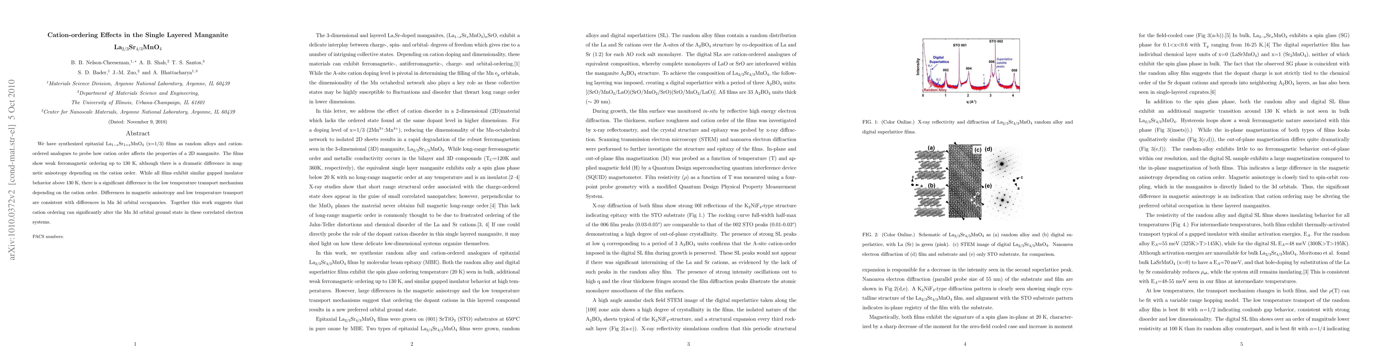 We have synthesized epitaxial La(1-x)Sr(1+x)MnO4 (x=1/3) films as random alloys and cation-ordered analogues to probe how cation order affects the properties of a 2D manganite. The films show weak ferromagnetic ordering up to 130 K, although there is a dramatic difference in magnetic anisotropy depending on the cation order. While all films exhibit similar gapped insulator behavior above 130 K, there is a significant difference in the low temperature transport mechanism depending on the cation order. Differences in magnetic anisotropy and low temperature transport are consistent with differences in Mn 3d orbital occupancies. Together this work suggests that cation ordering can significantly alter the Mn 3d orbital ground state in these correlated electron systems.