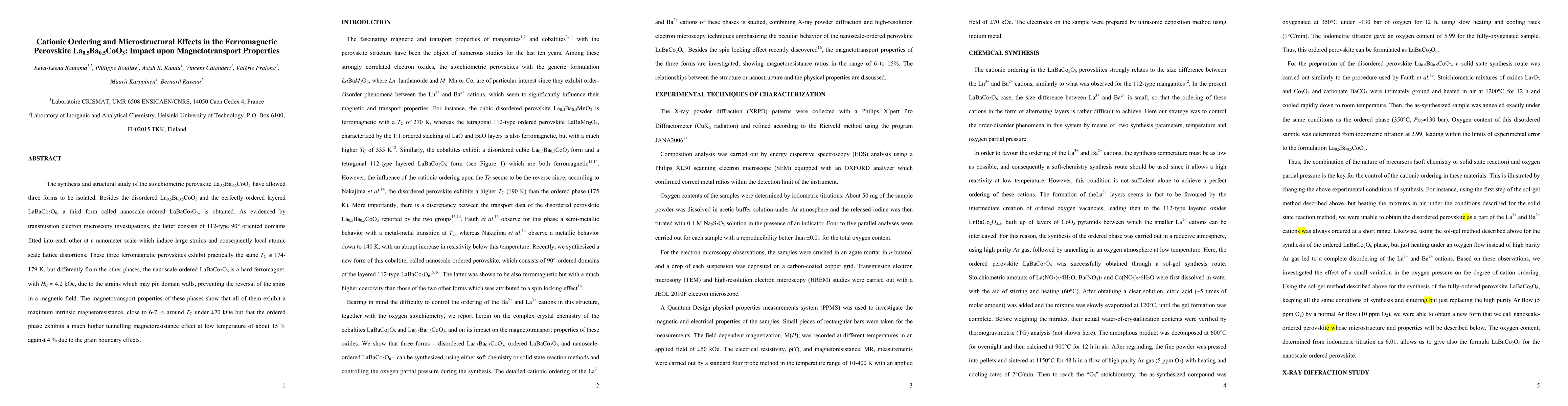 This study investigates three forms of the perovskite La0.5Ba0.5CoO3, revealing distinct cationic ordering and microstructural effects that influence their magnetotransport properties. The nanoscale-ordered form exhibits a higher tunnelling magnetoresistance effect due to domain wall pinning by induced strains, highlighting the significance of structural order in magnetic and transport behaviors.