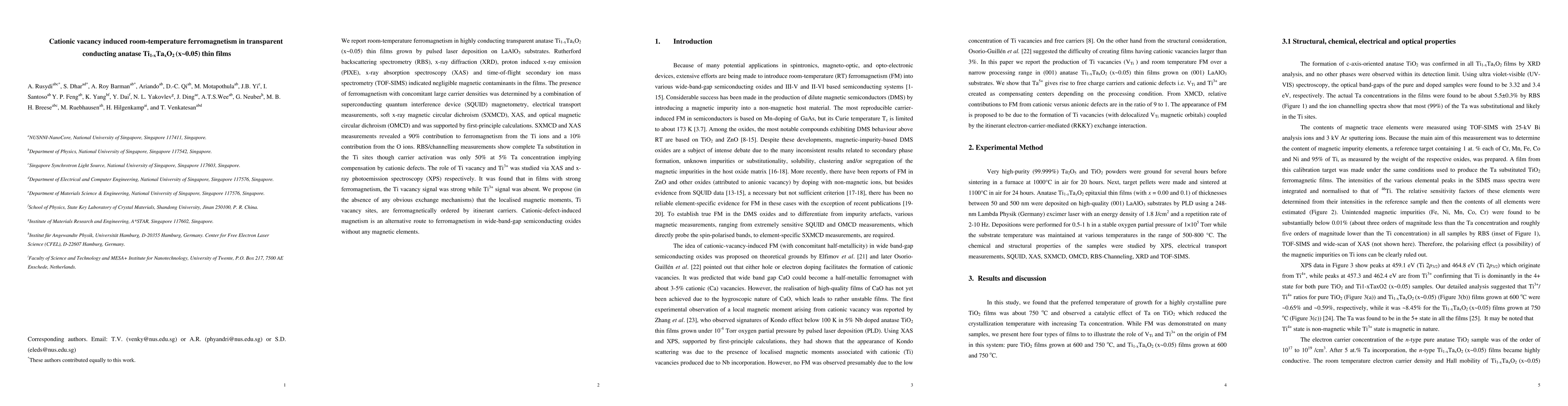 This paper reports room-temperature ferromagnetism in transparent conducting anatase Ti1-xTaxO2 thin films, induced by cationic vacancies and Ti3+ ions, with no magnetic impurities detected. The ferromagnetism is attributed to the localised magnetic moments from Ti vacancy sites, ordered by itinerant carriers.
