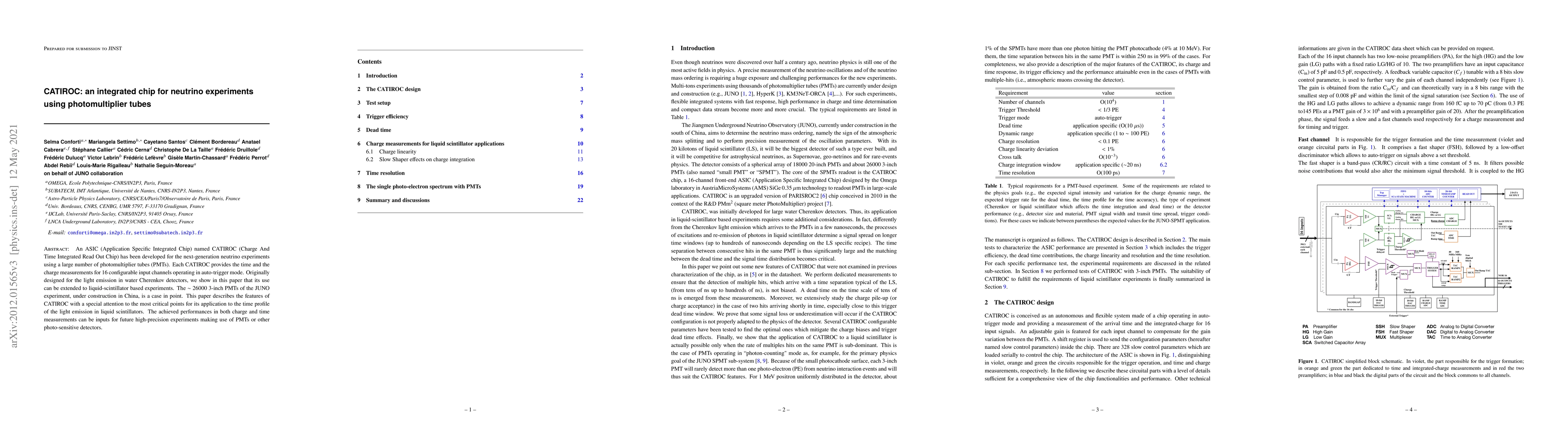 An ASIC named CATIROC (Charge And Time Integrated Read Out Chip) has been developed for the next-generation neutrino experiments using a large number of photomultiplier tubes (PMTs). Each CATIROC provides the time and the charge measurements for 16 configurable input channels operating in trigger-less mode. Originally designed for the light emission in water Cherenkov detectors, we show in this paper that its use can be extended to liquid-scintillator based experiments. The $\sim$26000 3-inch PMTs of the JUNO experiment, under construction in China, is a case in point. This paper describes the features of CATIROC with a special attention to the most critical points for its application to the time profile of the light emission in liquid scintillators. The achieved performances in both charge and time measurements can be inputs for future high-precision experiments making use of PMTs or other photo-sensitive detectors.