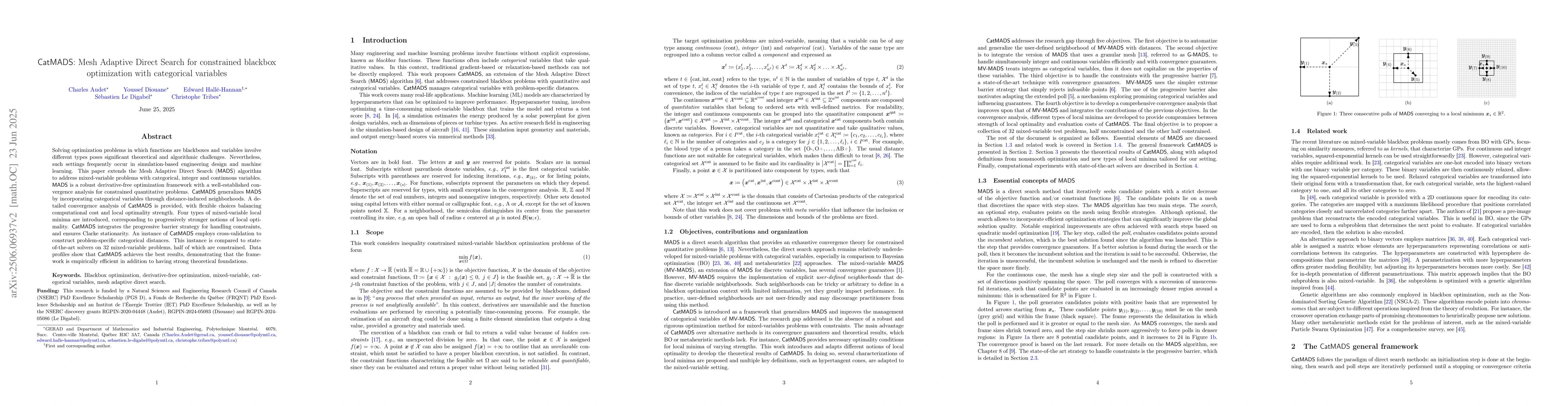 This research is significant as it addresses the challenge of mixed-variable optimization problems, which frequently occur in simulation-based engineering design and machine learning. By extending MADS to handle categorical variables, CatMADS provides a robust derivative-free optimization framework with theoretical convergence guarantees.