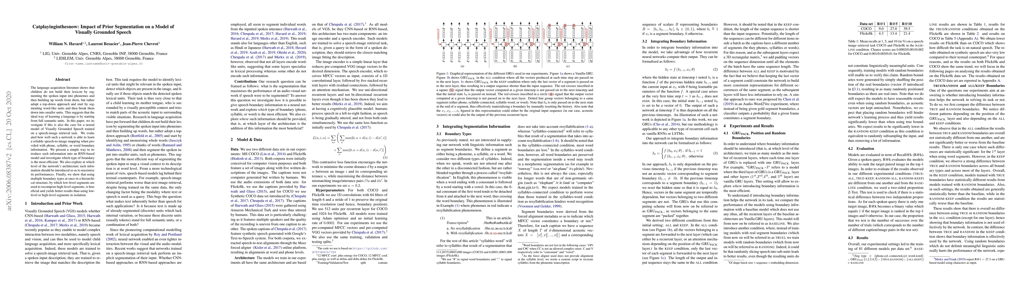 The language acquisition literature shows that children do not build their lexicon by segmenting the spoken input into phonemes and then building up words from them, but rather adopt a top-down approach and start by segmenting word-like units and then break them down into smaller units. This suggests that the ideal way of learning a language is by starting from full semantic units. In this paper, we investigate if this is also the case for a neural model of Visually Grounded Speech trained on a speech-image retrieval task. We evaluated how well such a network is able to learn a reliable speech-to-image mapping when provided with phone, syllable, or word boundary information. We present a simple way to introduce such information into an RNN-based model and investigate which type of boundary is the most efficient. We also explore at which level of the network's architecture such information should be introduced so as to maximise its performances. Finally, we show that using multiple boundary types at once in a hierarchical structure, by which low-level segments are used to recompose high-level segments, is beneficial and yields better results than using low-level or high-level segments in isolation.