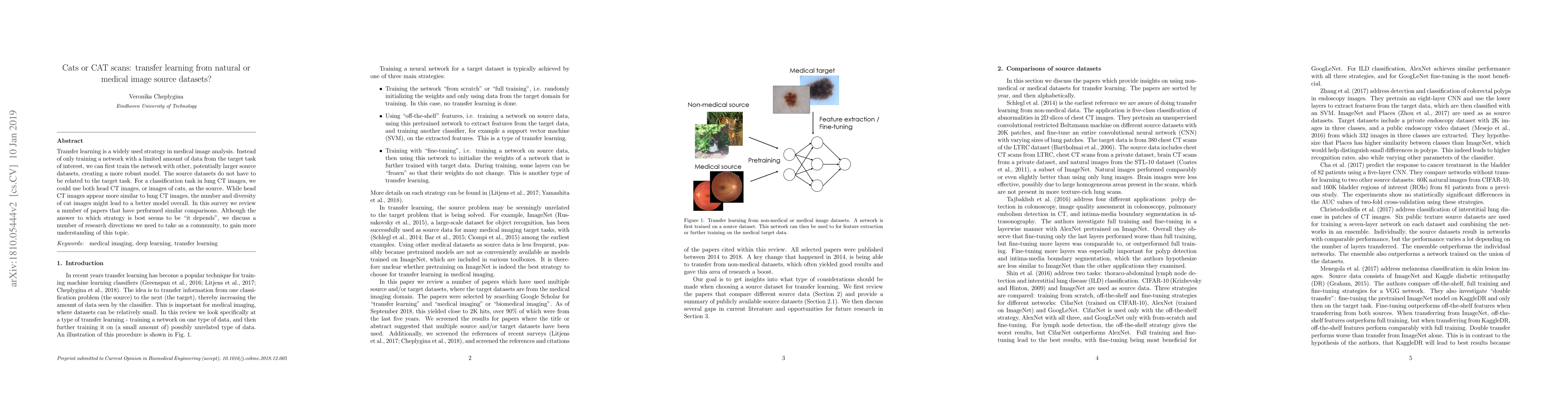 Researchers explored using transfer learning from natural images (e.g., cat pictures) to improve accuracy in medical image analysis. They found that the best approach depends on the specific dataset, but more diverse source datasets may lead to better models overall.
