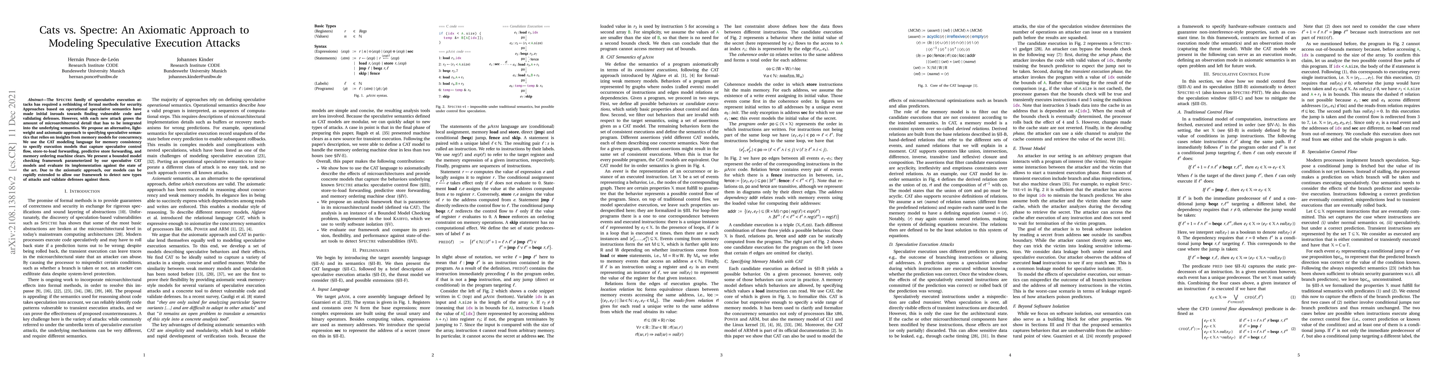 The Spectre family of speculative execution attacks have required a rethinking of formal methods for security. Approaches based on operational speculative semantics have made initial inroads towards finding vulnerable code and validating defenses. However, with each new attack grows the amount of microarchitectural detail that has to be integrated into the underlying semantics. We propose an alternative, light-weight and axiomatic approach to specifying speculative semantics that relies on insights from memory models for concurrency. We use the CAT modeling language for memory consistency to specify execution models that capture speculative control flow, store-to-load forwarding, predictive store forwarding, and memory ordering machine clears. We present a bounded model checking framework parametrized by our speculative CAT models and evaluate its implementation against the state of the art. Due to the axiomatic approach, our models can be rapidly extended to allow our framework to detect new types of attacks and validate defenses against them.