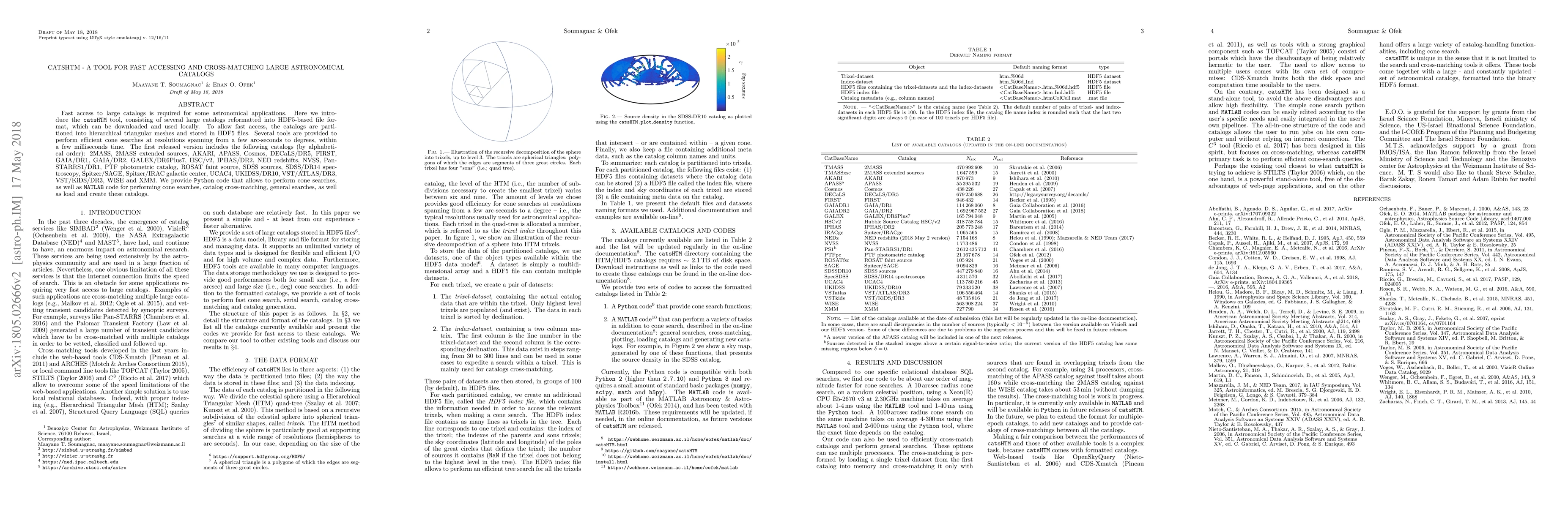 The catsHTM tool reformats large astronomical catalogs into HDF5 files for efficient local access, utilizing hierarchical triangular meshes for fast cone searches. It includes numerous catalogs and offers Python and MATLAB code for cone searches and catalog cross-matching.