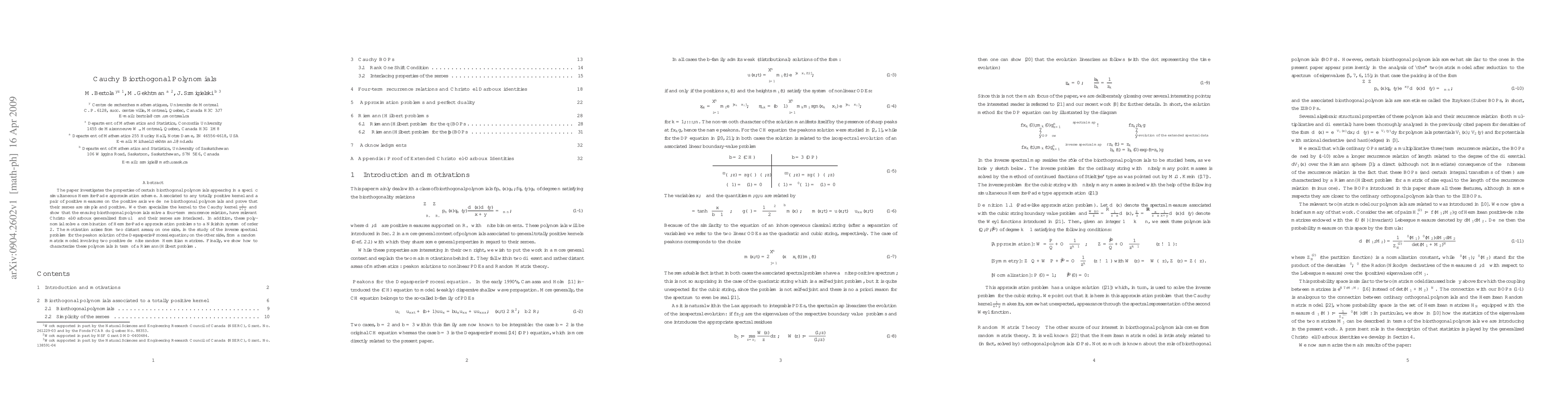 This paper explores Cauchy biorthogonal polynomials within a Hermite-Pade' approximation framework, proving their zeroes are simple and positive. Specializing to the Cauchy kernel, it demonstrates their recurrence relation and interlaced zeroes, linking them to both spectral problems and random matrix models, and characterizes them via a Riemann-Hilbert problem.