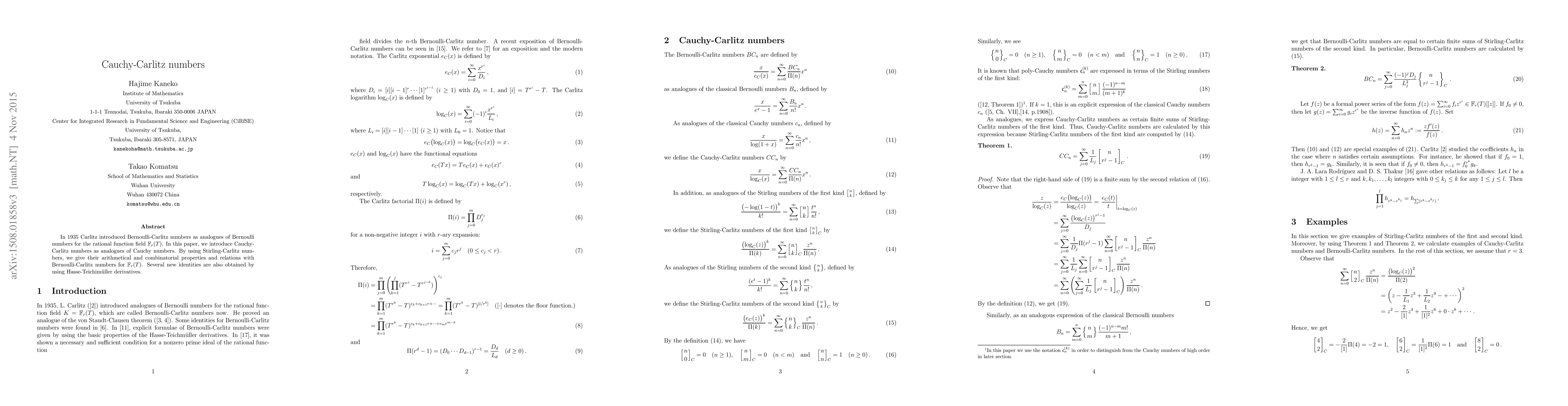 This paper introduces Cauchy-Carlitz numbers as analogues of Cauchy numbers for the rational function field $\mathbb F_r(T)$, exploring their arithmetical and combinatorial properties and connections to Bernoulli-Carlitz numbers, along with new identities derived using Hasse-Teichmüller derivatives.