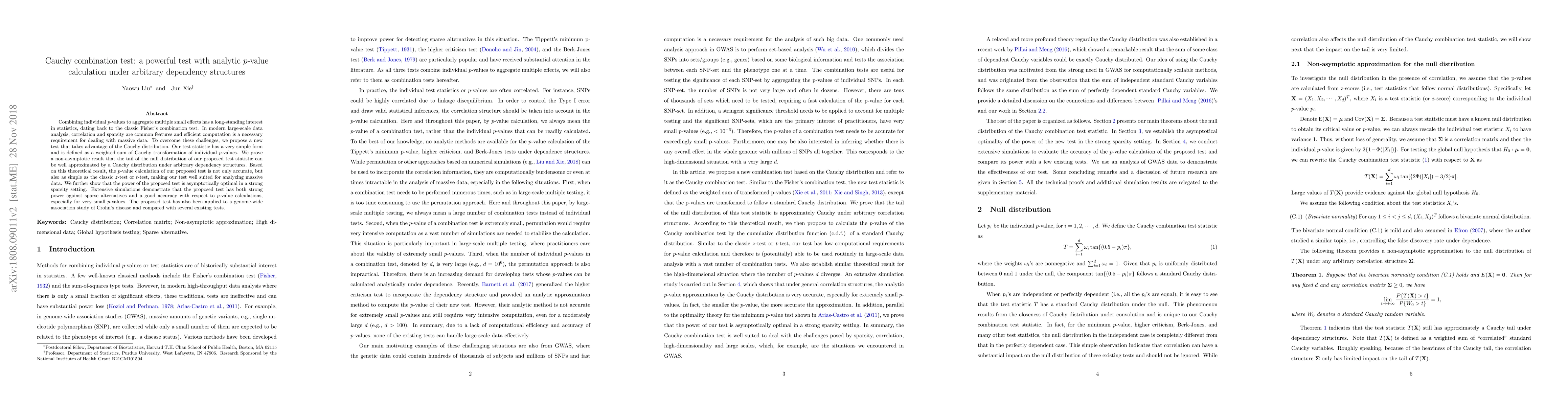 The paper introduces a new Cauchy combination test for aggregating multiple small effects, offering an efficient and accurate p-value calculation under arbitrary dependency structures. The test's power is shown to be asymptotically optimal in sparse settings, and it performs well in simulations and a genome-wide association study.