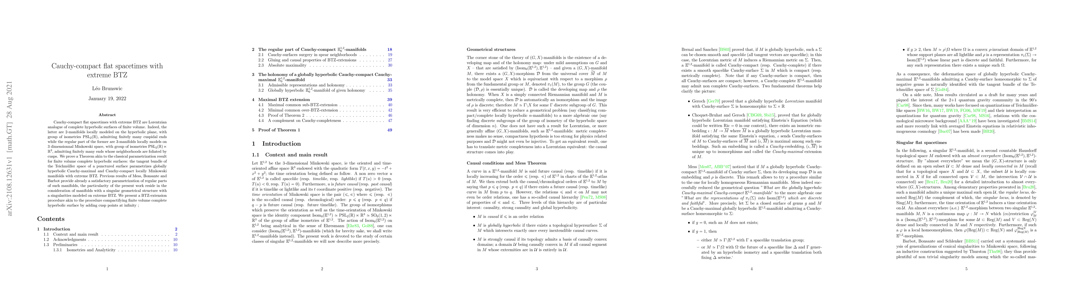 This paper explores Lorentzian analogues of complete hyperbolic surfaces, focusing on Cauchy-compact flat spacetimes with extreme BTZ geometry. It establishes a theorem that globally parametrizes these manifolds, extending previous work by considering singular structures modeled on extreme BTZ and introducing a BTZ-extension procedure.
