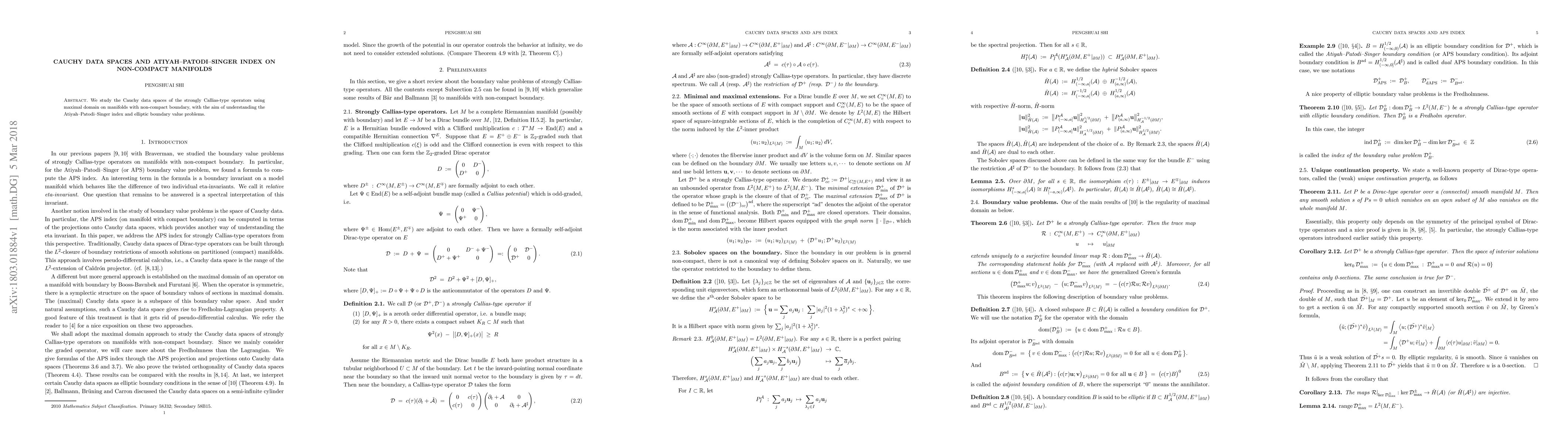 Summary: This paper investigates the Cauchy data spaces of strongly Callias-type operators on non-compact manifolds with boundaries, aiming to better understand the Atiyah-Patodi-Singer index and elliptic boundary value problems.