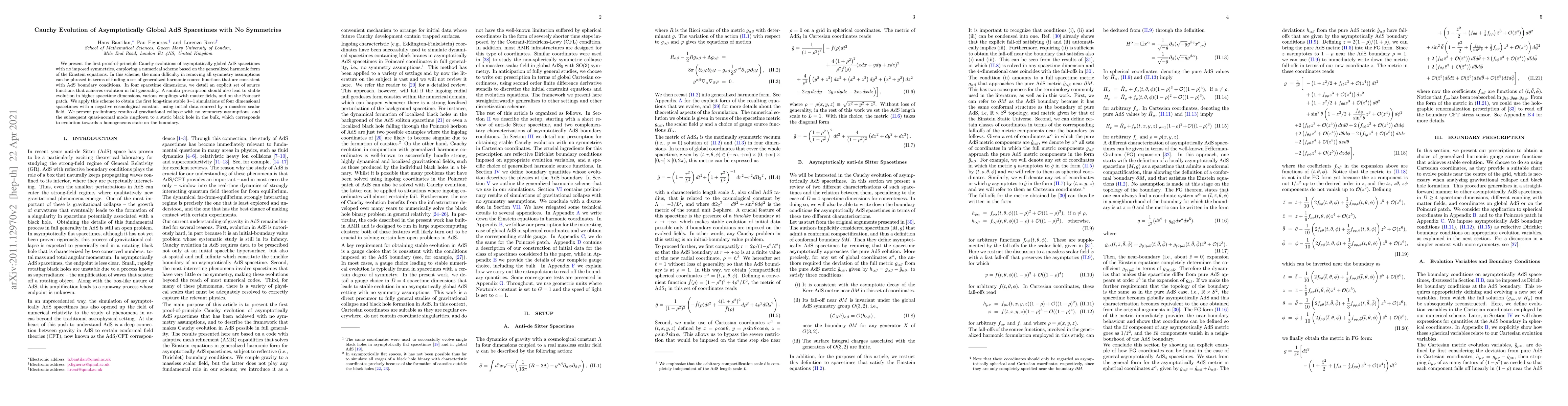 This paper presents the first numerical proof of Cauchy evolution for asymptotically global AdS spacetimes without imposed symmetries, using a generalized harmonic scheme. The authors detail a set of source functions for four-dimensional spacetimes, achieving stable long-time simulations of gravitational collapse and ringdown to a static black hole.