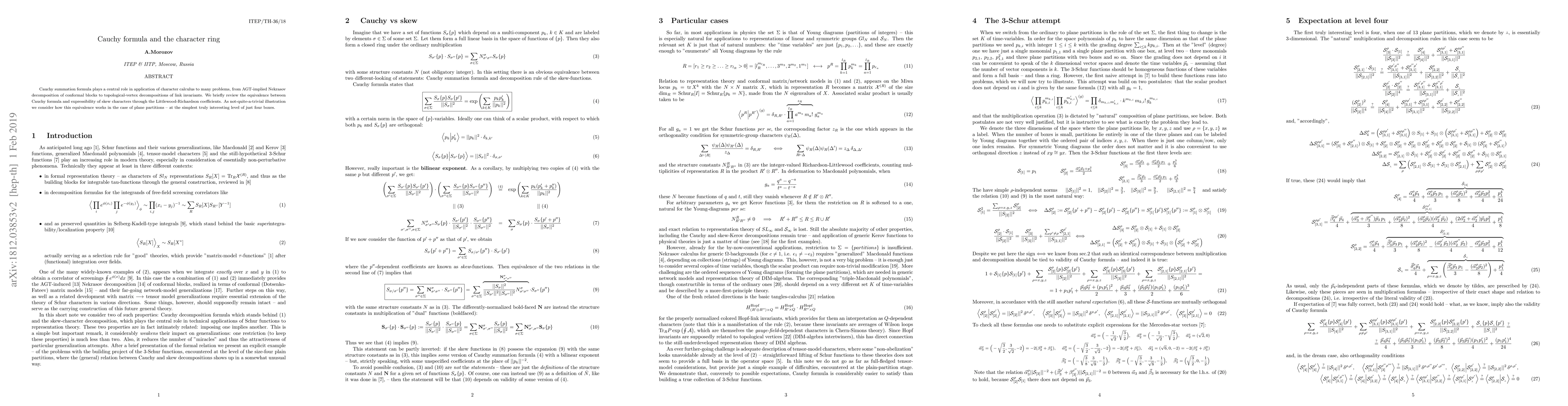 Cauchy summation formula plays a central role in application of character calculus to many problems, from AGT-implied Nekrasov decomposition of conformal blocks to topological-vertex decompositions of link invariants. We briefly review the equivalence between Cauchy formula and expressibility of skew characters through the Littlewood-Richardson coefficients. As not-quite-a-trivial illustration we consider how this equivalence works in the case of plane partitions -- at the simplest truly interesting level of just four boxes.