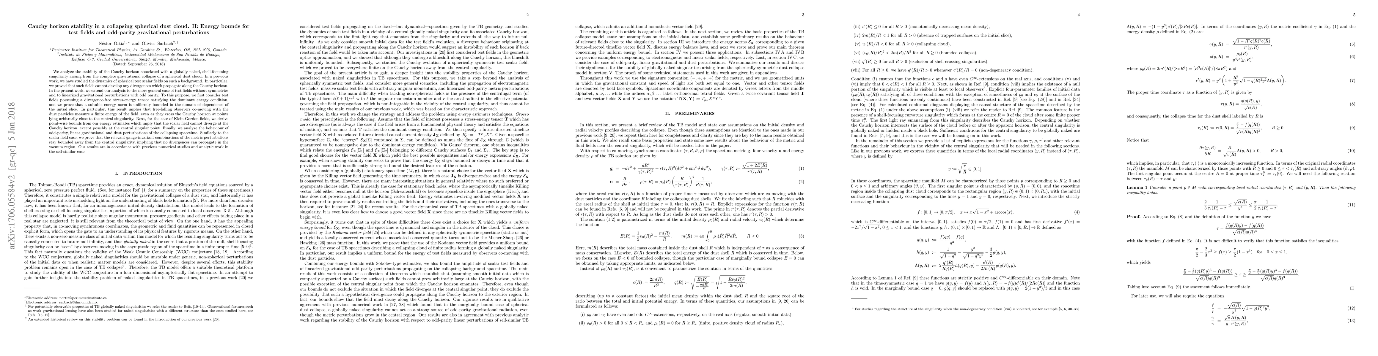 We analyze the stability of the Cauchy horizon associated with a globally naked, shell-focussing singularity arising from the complete gravitational collapse of a spherical dust cloud. In previous work, we have studied the dynamics of spherical test scalar fields on such a background. In particular, we proved that such fields cannot develop any divergences which propagate along the Cauchy horizon. In the present work, we extend our analysis to the more general case of test fields without symmetries and to linearized gravitational perturbations with odd parity. To this purpose, we first consider test fields possessing a divergence-free stress-energy tensor satisfying the dominant energy condition, and we prove that a suitable energy norm is uniformly bounded in the domain of dependence of the initial slice. In particular, this result implies that free-falling observers co-moving with the dust particles measure a finite energy of the field, even as they cross the Cauchy horizon at points lying arbitrarily close to the central singularity. Next, for the case of Klein-Gordon fields, we derive point-wise bounds from our energy estimates which imply that the scalar field cannot diverge at the Cauchy horizon, except possibly at the central singular point. Finally, we analyze the behaviour of odd-parity, linear gravitational and dust perturbations of the collapsing spacetime. Similarly to the scalar field case, we prove that the relevant gauge-invariant combinations of the metric perturbations stay bounded away from the central singularity, implying that no divergences can propagate in the vacuum region. Our results are in accordance with previous numerical studies and analytic work in the self-similar case.