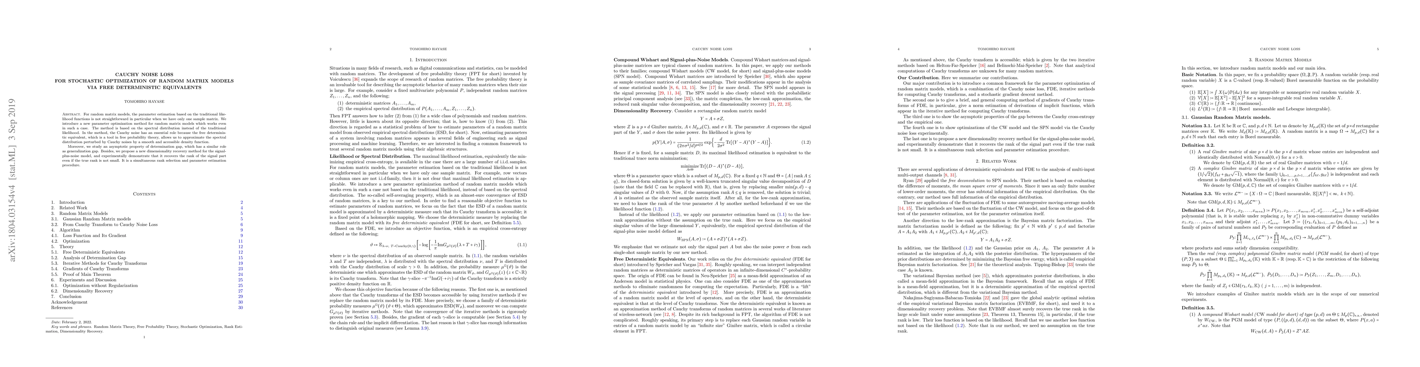 This paper introduces a novel optimization method for random matrix models using Cauchy noise loss, based on spectral distribution instead of traditional likelihood. It leverages free deterministic equivalents from free probability theory for approximation and proposes a new dimensionality recovery method for signal-plus-noise models, demonstrating effective rank selection even for large true ranks.