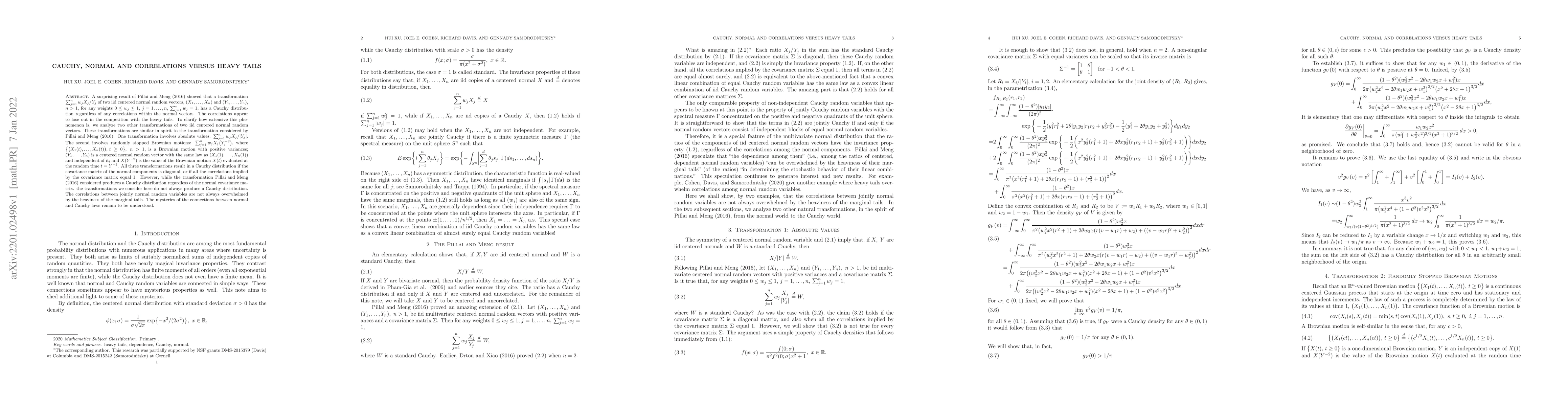 A surprising result of Pillai and Meng (2016) showed that a transformation $\sum_{j=1}^n w_j X_j/Y_j$ of two iid centered normal random vectors, $(X_1,\ldots, X_n)$ and $(Y_1,\ldots, Y_n)$, $n>1$, for any weights $0\leq w_j\leq 1$, $ j=1,\ldots, n$, $\sum_{j=1}^n w_j=1$, has a Cauchy distribution regardless of any correlations within the normal vectors. The correlations appear to lose out in the competition with the heavy tails. To clarify how extensive this phenomenon is, we analyze two other transformations of two iid centered normal random vectors. These transformations are similar in spirit to the transformation considered by Pillai and Meng (2016). One transformation involves absolute values: $\sum_{j=1}^n w_j X_j/|Y_j|$. The second involves randomly stopped Brownian motions: $\sum_{j=1}^n w_j X_j\bigl(Y_j^{-2}\bigr)$, where $\bigl\{\bigl( X_1(t),\ldots, X_n(t)\bigr), \, t\geq 0\bigr\},\ n>1,$ is a Brownian motion with positive variances; $(Y_1,\ldots, Y_n)$ is a centered normal random vector with the same law as $( X_1(1),\ldots, X_n(1))$ and independent of it; and $X(Y^{-2})$ is the value of the Brownian motion $X(t)$ evaluated at the random time $t=Y^{-2}$. All three transformations result in a Cauchy distribution if the covariance matrix of the normal components is diagonal, or if all the correlations implied by the covariance matrix equal 1. However, while the transformation Pillai and Meng (2016) considered produces a Cauchy distribution regardless of the normal covariance matrix. the transformations we consider here do not always produce a Cauchy distribution. The correlations between jointly normal random variables are not always overwhelmed by the heaviness of the marginal tails. The mysteries of the connections between normal and Cauchy laws remain to be understood.