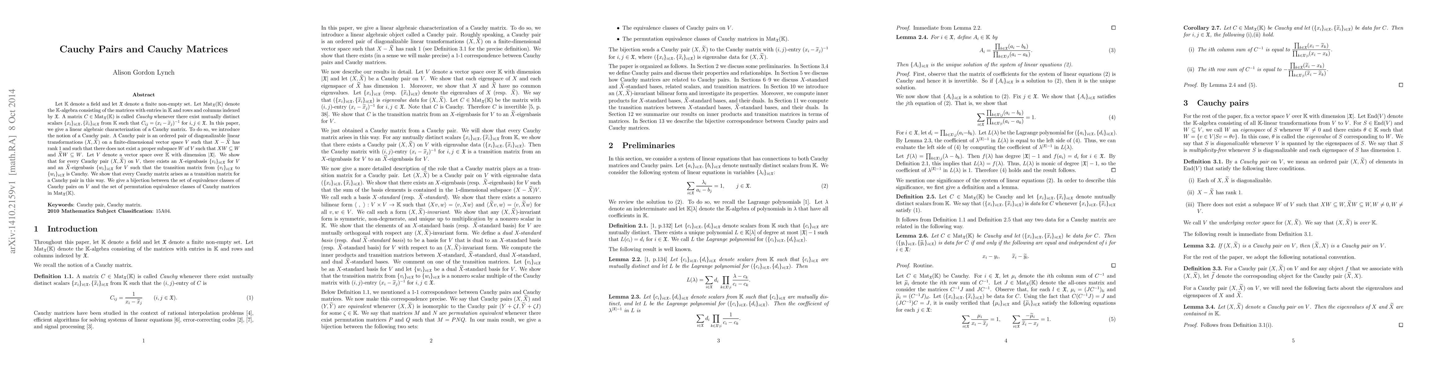 This paper characterizes Cauchy matrices through the notion of Cauchy pairs, which are pairs of diagonalizable linear transformations on a finite-dimensional vector space. It establishes a bijection between Cauchy pairs and Cauchy matrices, showing that every Cauchy matrix can be represented as a transition matrix from one eigenbasis to another.