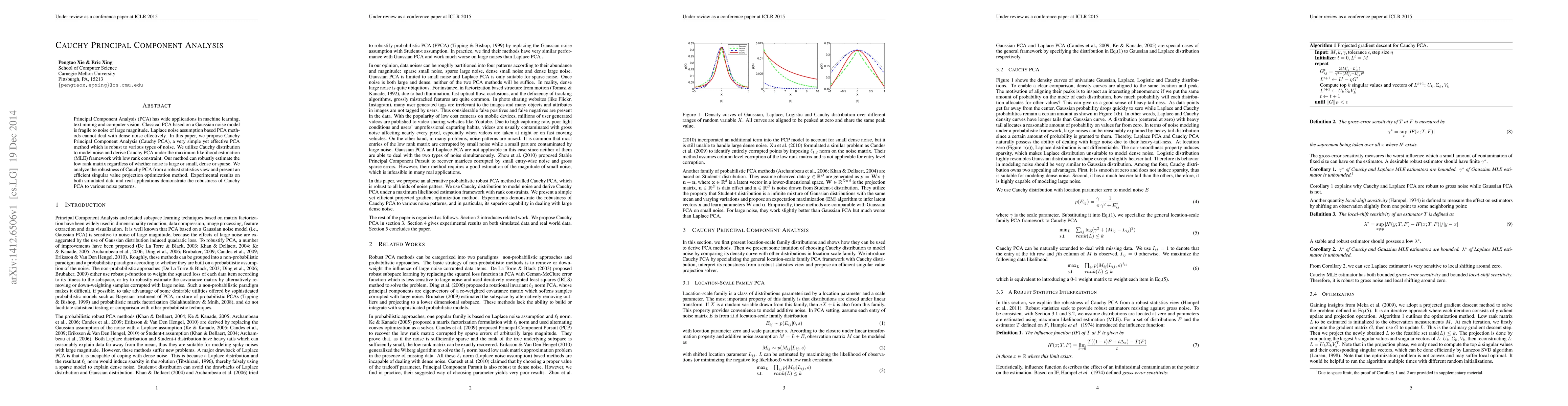 This paper proposes Cauchy Principal Component Analysis (Cauchy PCA) to address the limitations of classical PCA under various noise conditions. Utilizing the Cauchy distribution for noise modeling, Cauchy PCA robustly estimates low rank matrices, demonstrating effectiveness against both dense and sparse noise.
