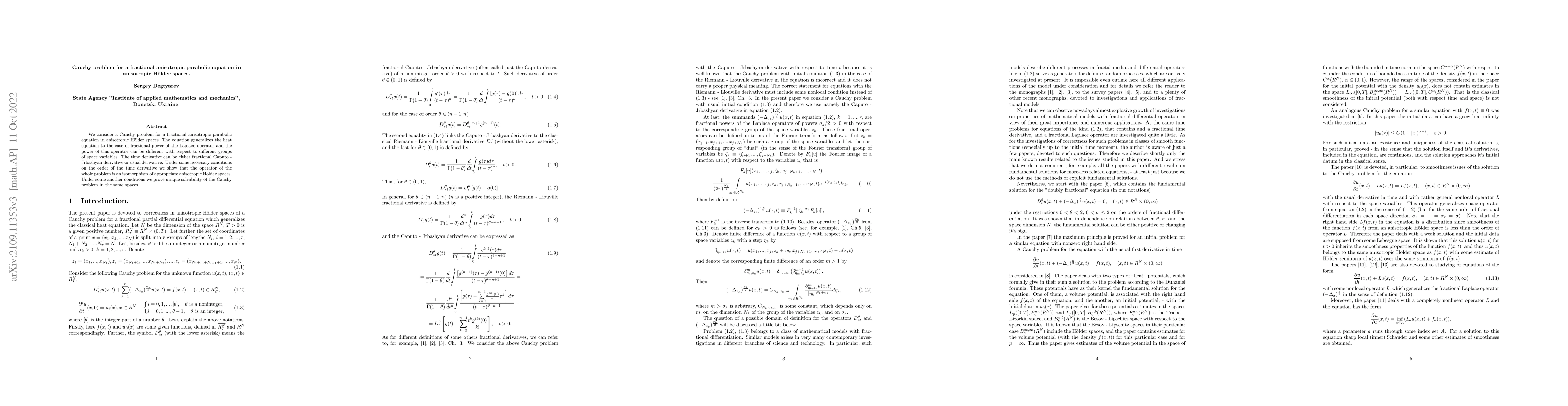 This paper studies the Cauchy problem for a generalized fractional anisotropic parabolic equation in anisotropic Hölder spaces. It proves that the operator for this problem is an isomorphism under certain conditions and demonstrates unique solvability under different conditions. The results are published in AIMS Evolution Equations and Control Theory. DOI: 10.3934/eect.2022029.