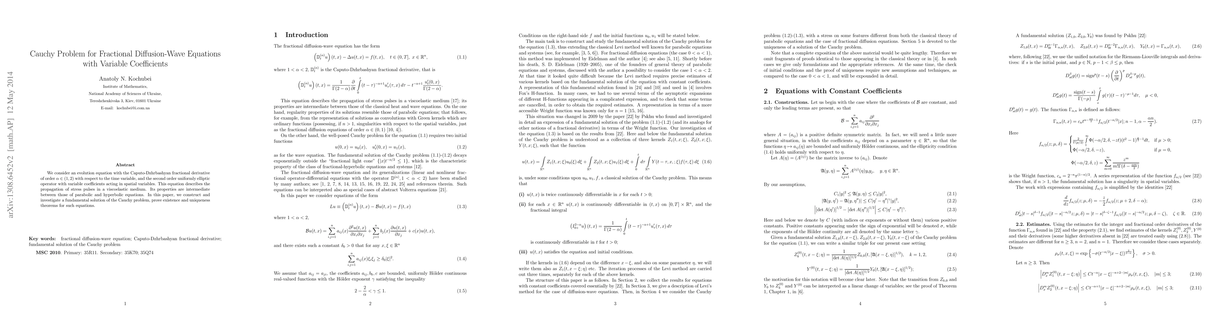 This paper constructs and investigates a fundamental solution for a fractional diffusion-wave equation with variable coefficients, proving existence and uniqueness theorems for the Cauchy problem. The equation models stress pulse propagation in viscoelastic media, exhibiting properties intermediate between parabolic and hyperbolic equations.