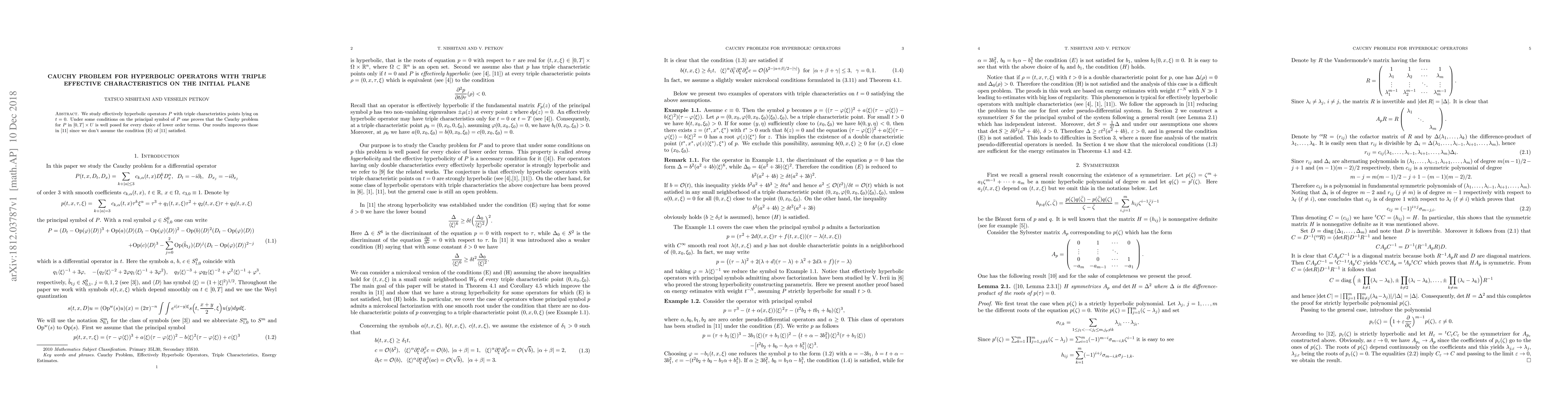 Summary: This paper investigates effectively hyperbolic operators with triple characteristics on the initial plane, proving the well-posedness of the Cauchy problem without requiring the condition (E) from prior work, thus improving upon existing results.
