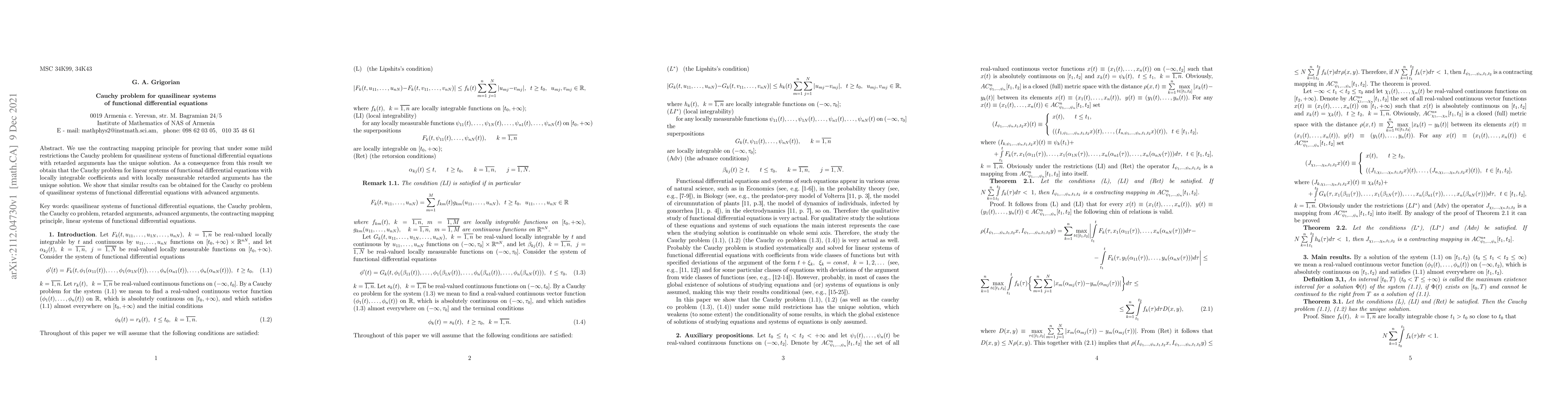 We use the contracting mapping principle for proving that under some mild restrictions the Cauchy problem for quasilinear systems of functional differential equations with retarded arguments has the unique solution. As a consequence from this result we obtain that the Cauchy problem for linear systems of functional differential equations with locally integrable coeffcients and with locally measurable retarded arguments has the unique solution. We show that similar results can be obtained for the Cauchy co problem of quasilinear systems of functional differential equations with advanced arguments.