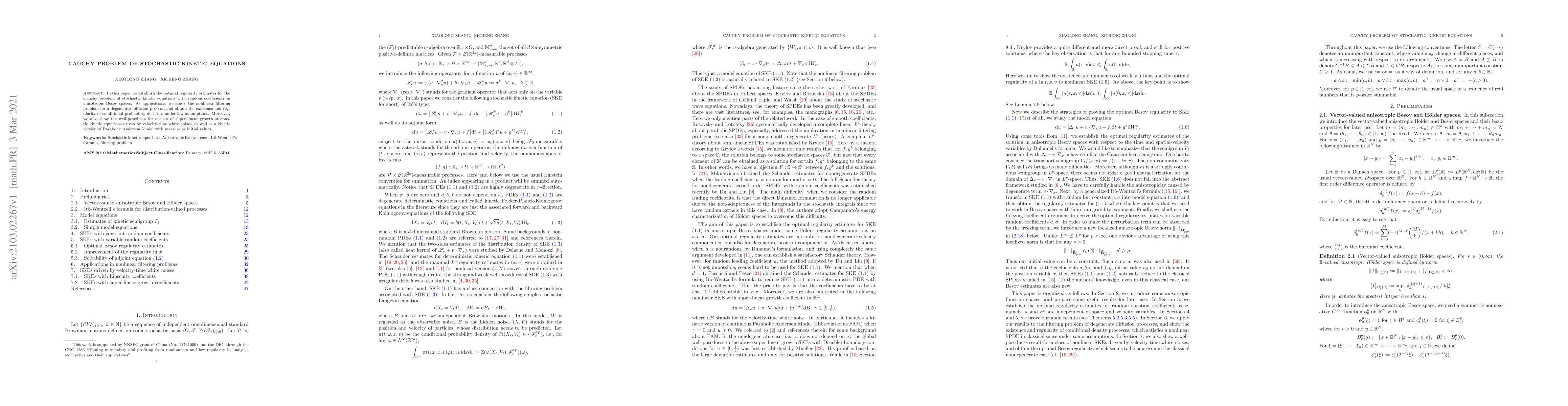This paper establishes optimal regularity estimates for the Cauchy problem of stochastic kinetic equations with random coefficients in anisotropic Besov spaces, and applies these results to study the nonlinear filtering problem, proving the existence and regularity of conditional probability densities. It also demonstrates well-posedness for super-linear growth stochastic kinetic equations and a kinetic version of the Parabolic Anderson Model.