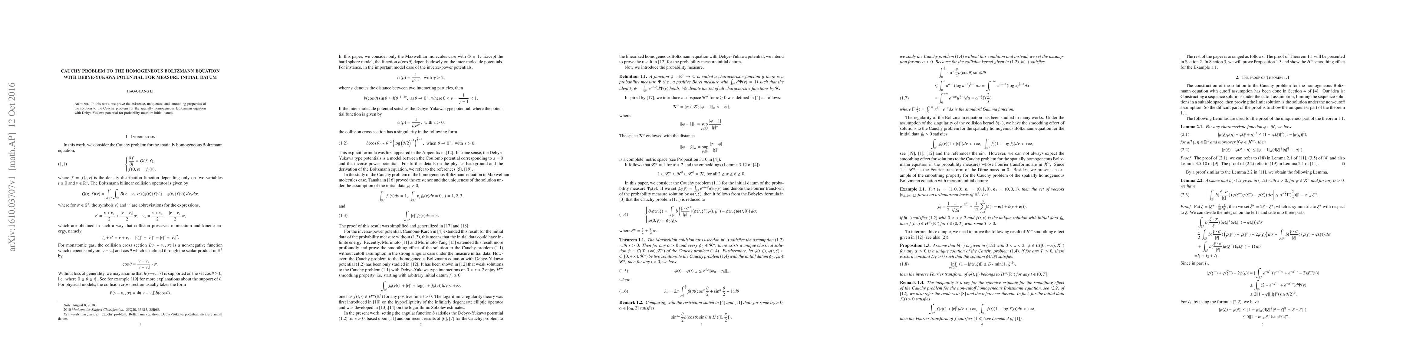 This paper establishes the existence, uniqueness, and smoothing properties of the solution to the Cauchy problem for the homogeneous Boltzmann equation with Debye-Yukawa potential, starting from a probability measure initial condition. The results demonstrate the equation's behavior over time.